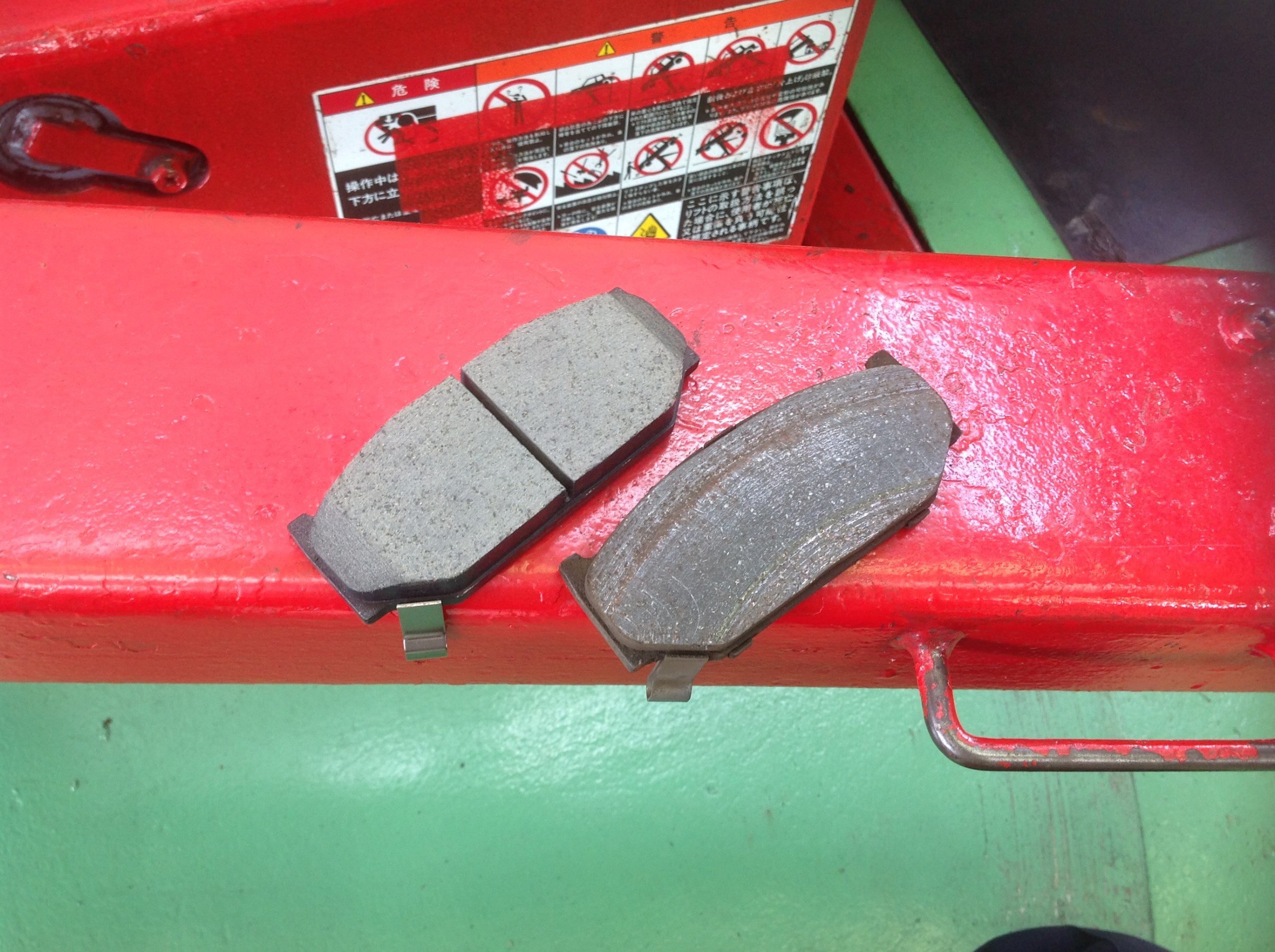 上の写真が段付き摩耗したブレーキパッドです。
