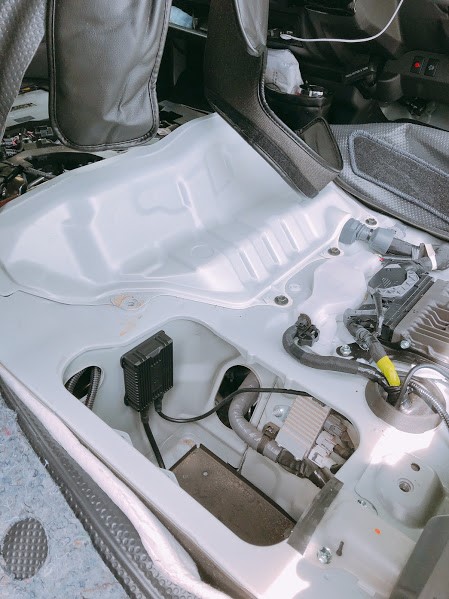 運転席下のBOX内にユニットを取付してエンジンルームに配線を通し