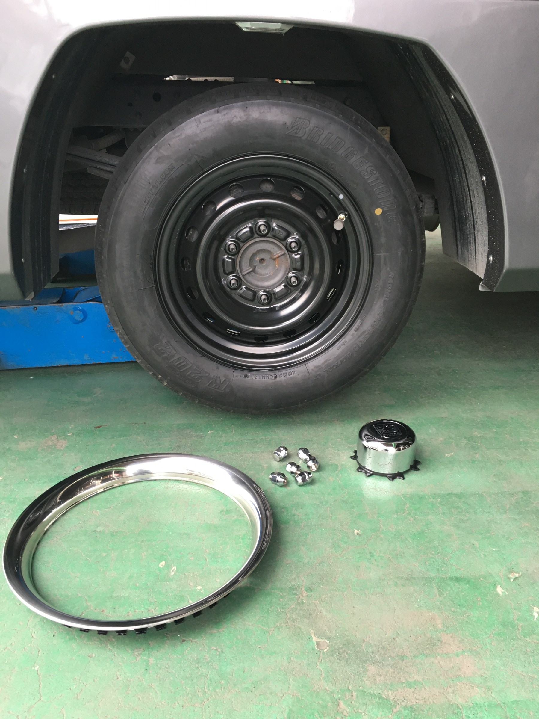 今回はタイヤ交換と一緒にスチールホイールにメッキリング、