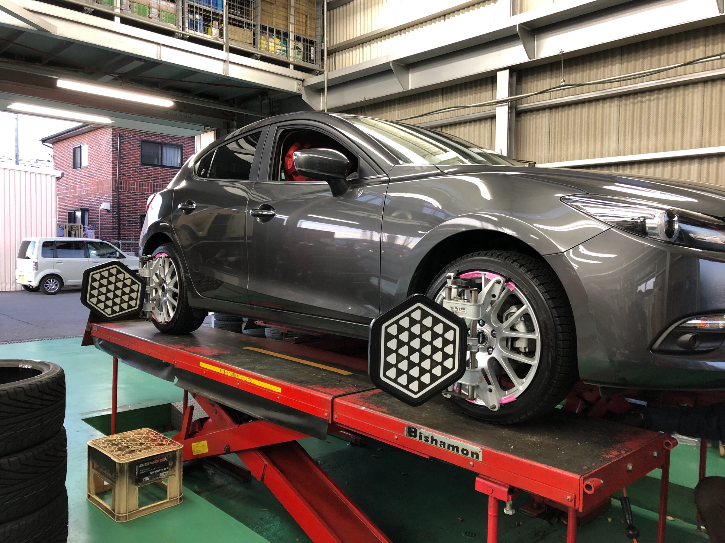 アクセラはスタッドレスの交換とアライメント調整でした。