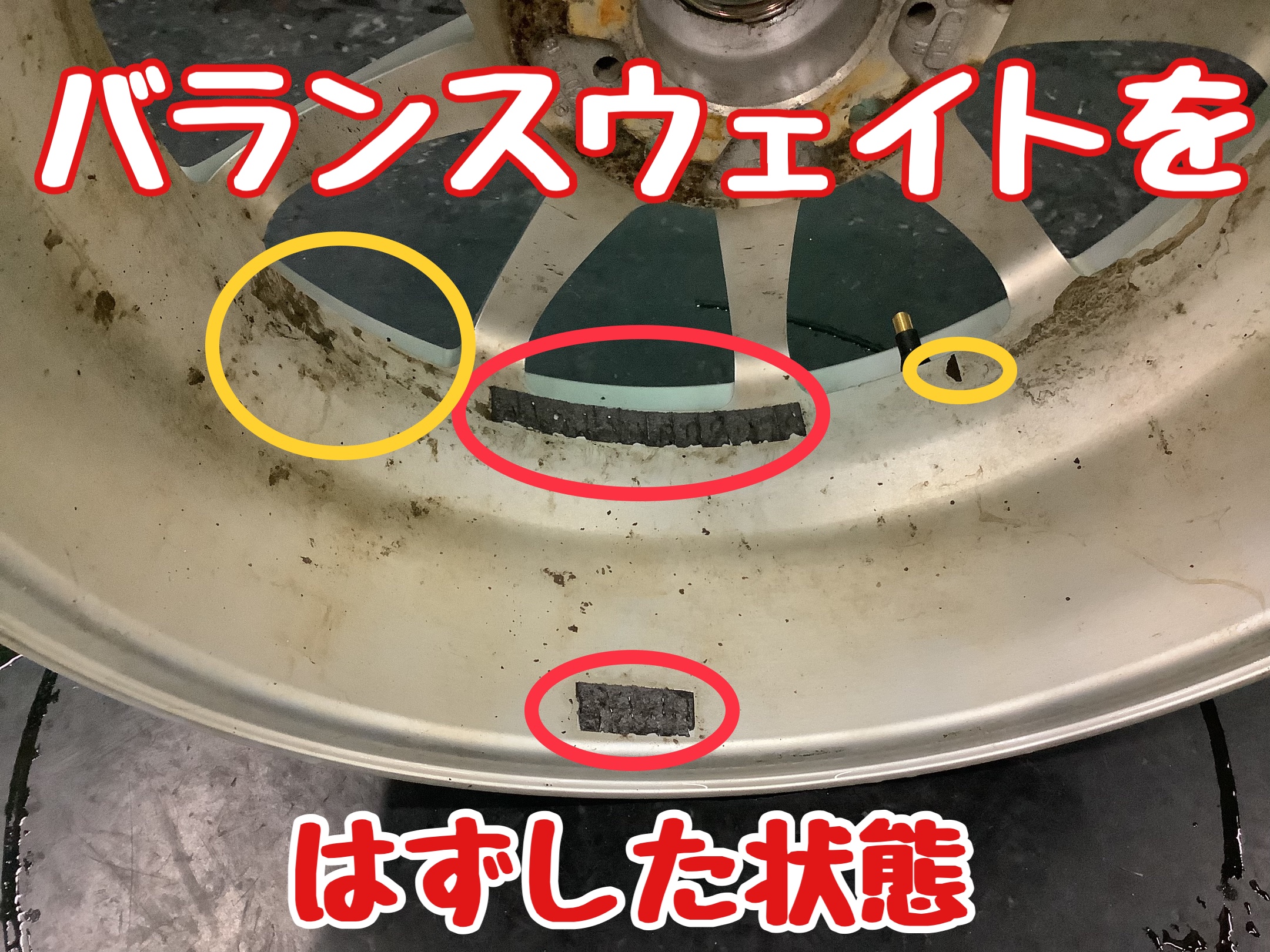 大体のアルミホイールにはハンドルがブレないようにバランスウェイトが貼られています。