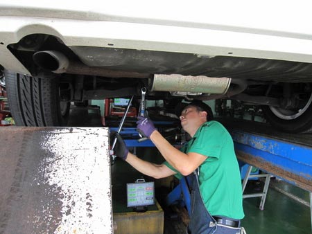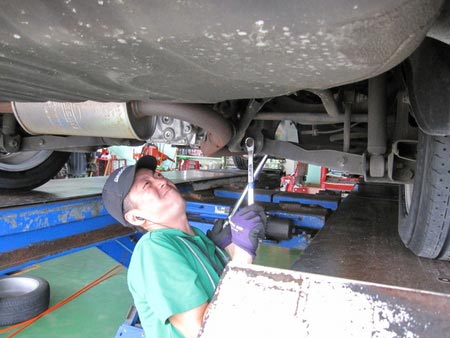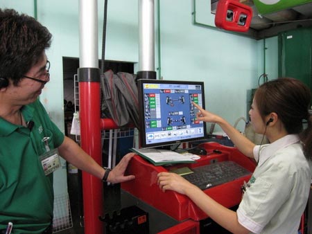 写真は、当店紅一点菅原スタッフ(アライメントについて勉強中)に指導している佐藤チーフと作業をしている私石川(宴会部長)の写真です。