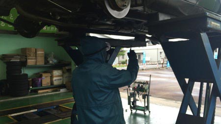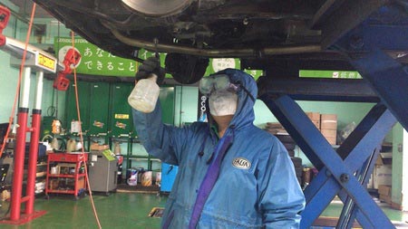 写真はピット長の桜井さんが下回りの防錆コーティングをしている所を激写しました☆