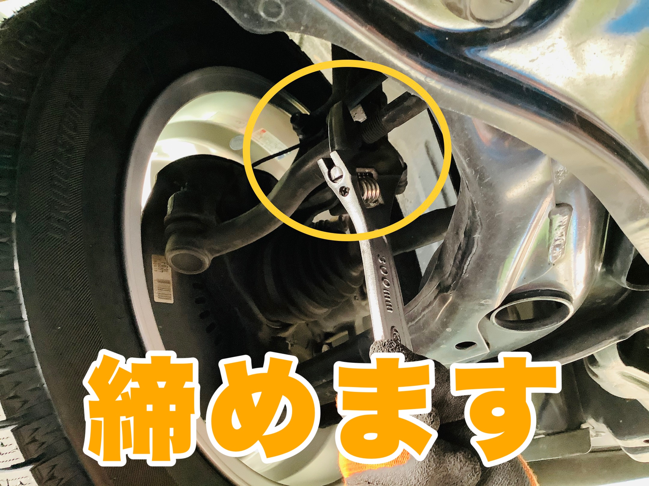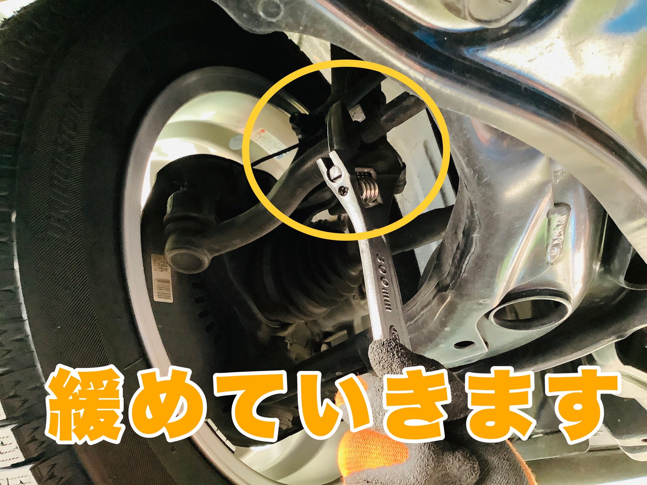 車の下に潜り込んで足廻りのボルトを緩めます。
