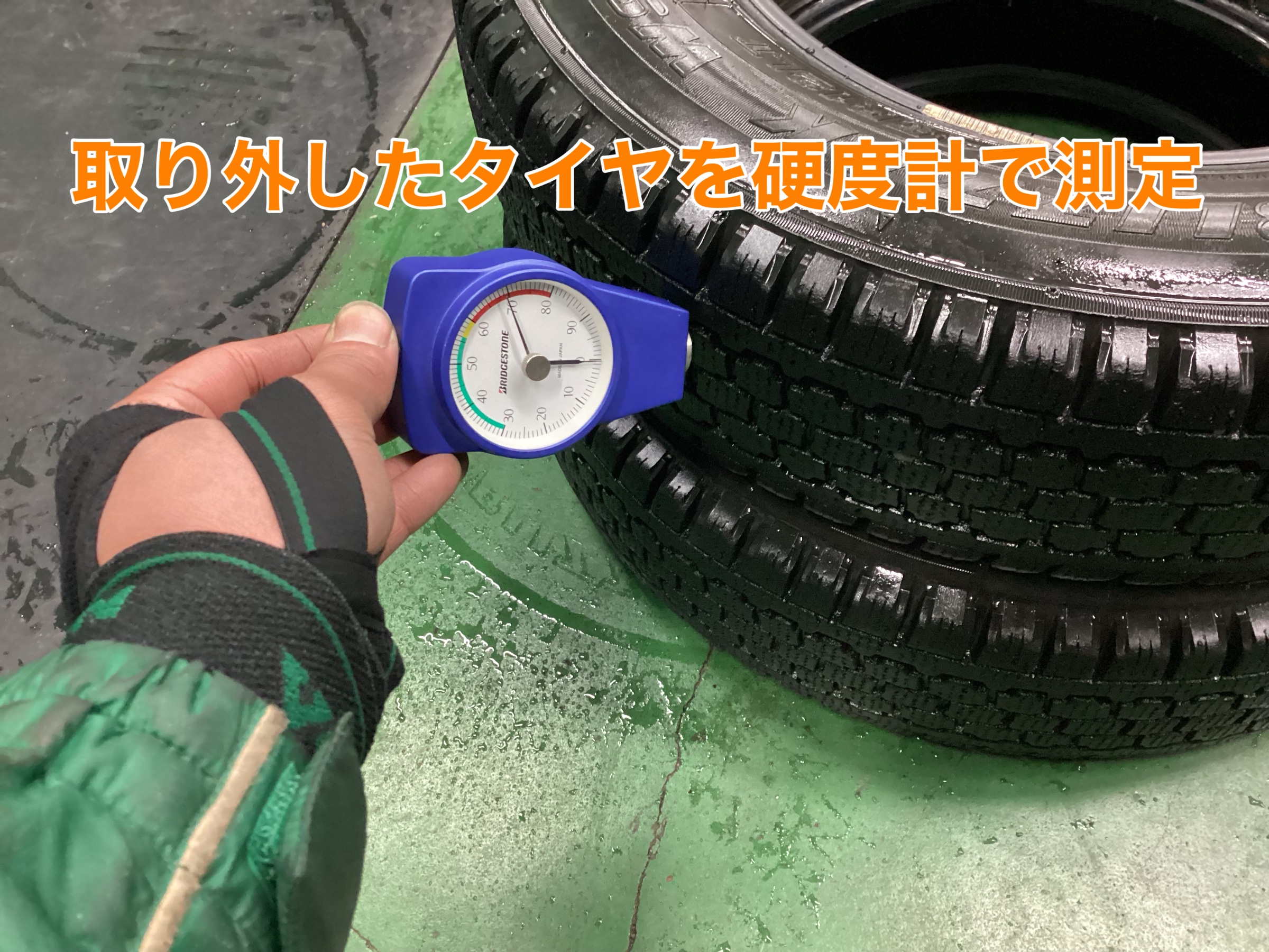 古いタイヤを取り外し、試しに硬度計で測ってみると、画像で見える通り