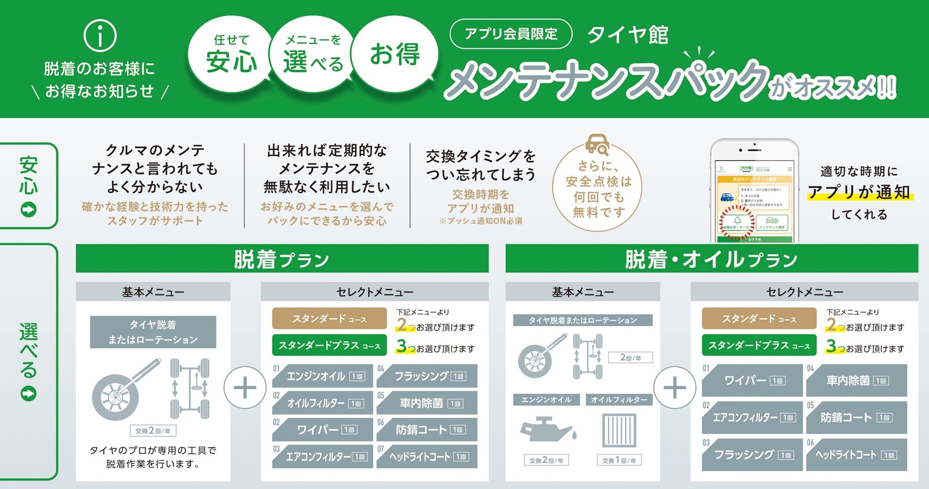 ①夏タイヤとスタッドレスタイヤの履き替えを毎シーズン実施されるお客様にお得な『脱着プラン』