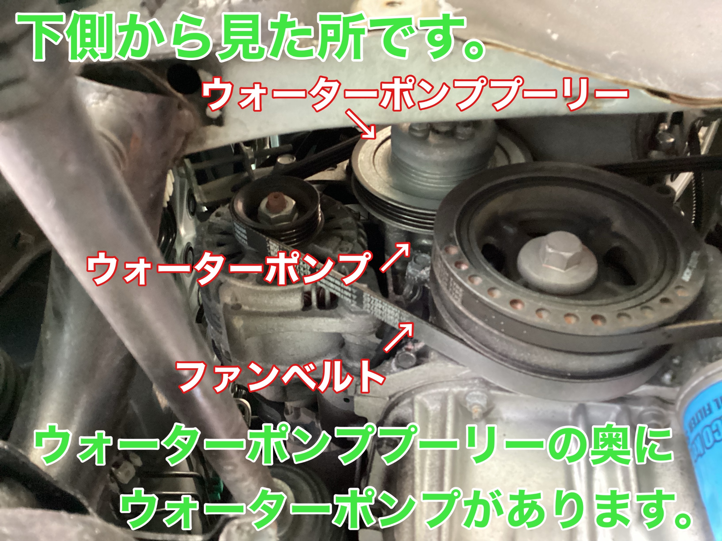 今回はウォーターポンプの他にファン・エアコンベルトとクーラント(冷却水)も