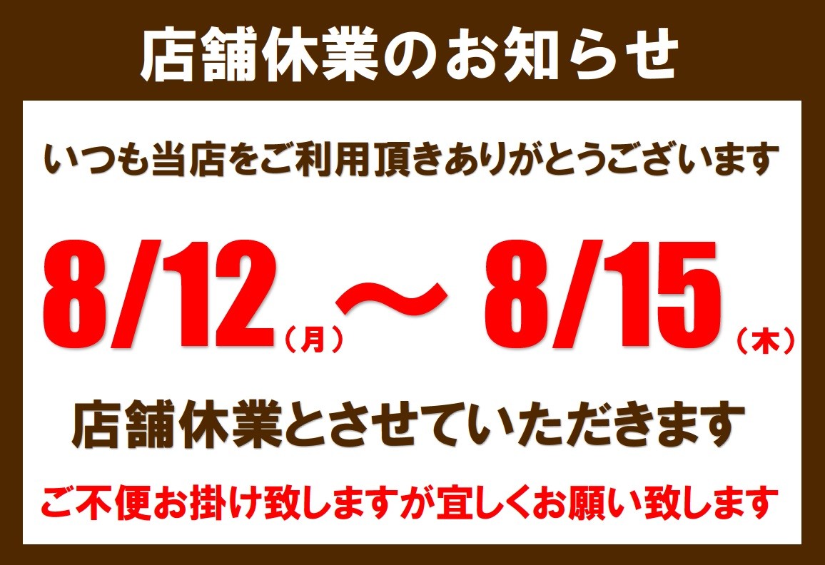 8/12(月)~8/15(木)店舗休業となります。ネットからタイヤ購入もできます。