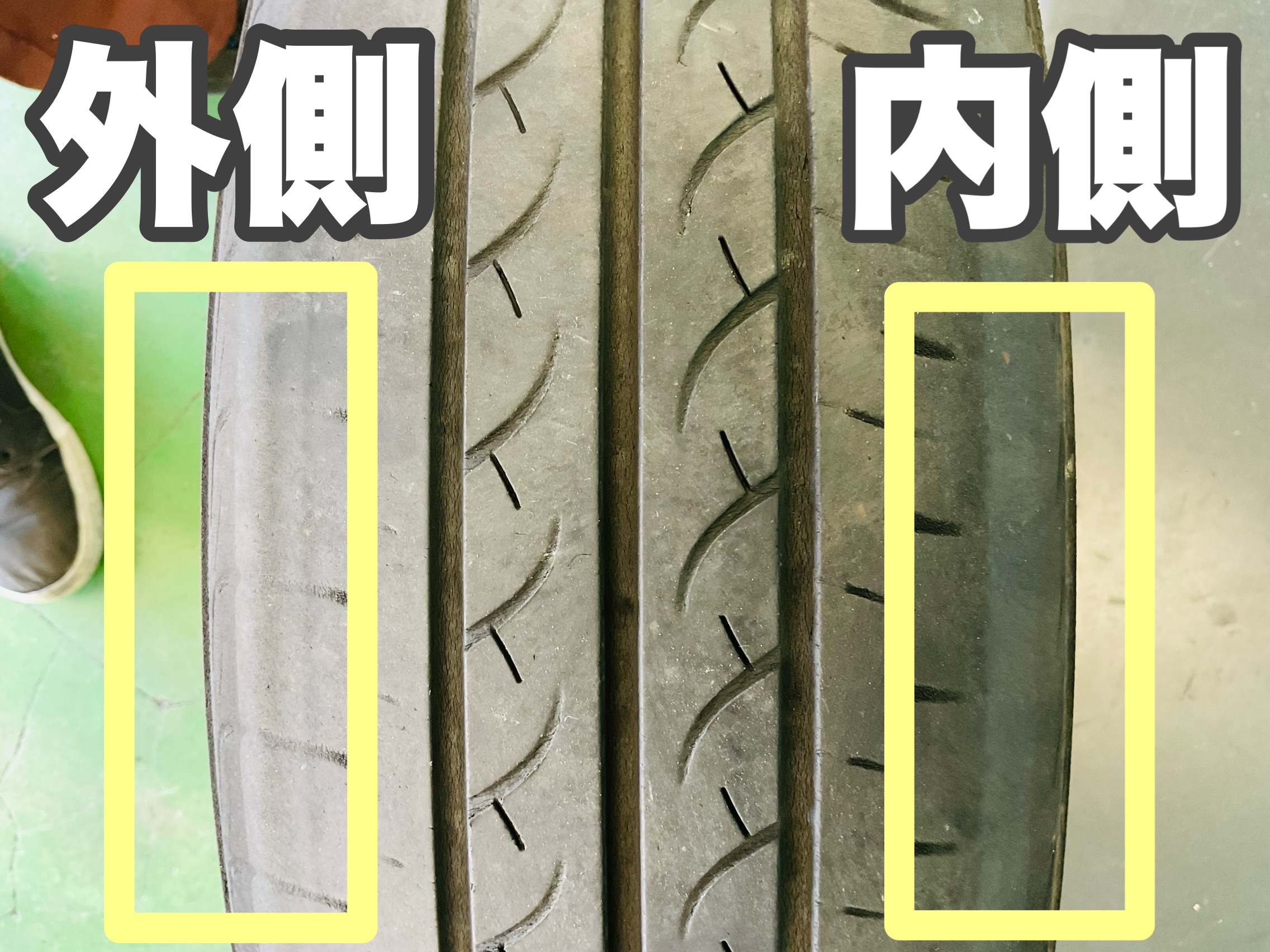 今まで使っていたタイヤをよく見てみると内側、外側、真ん中とタイヤの減り方が違っています。