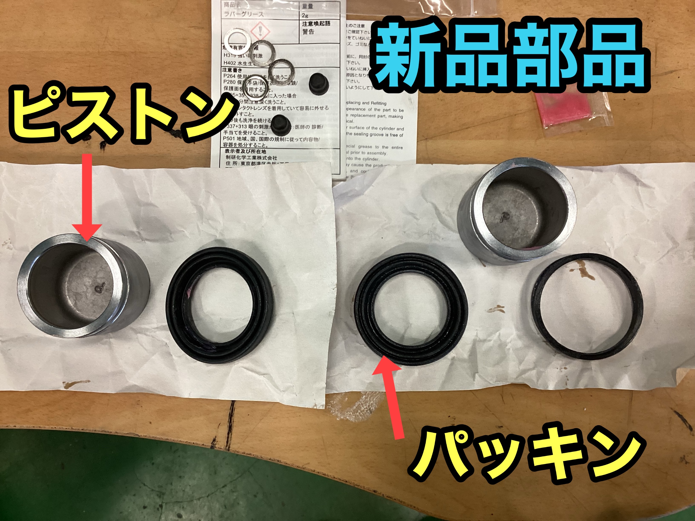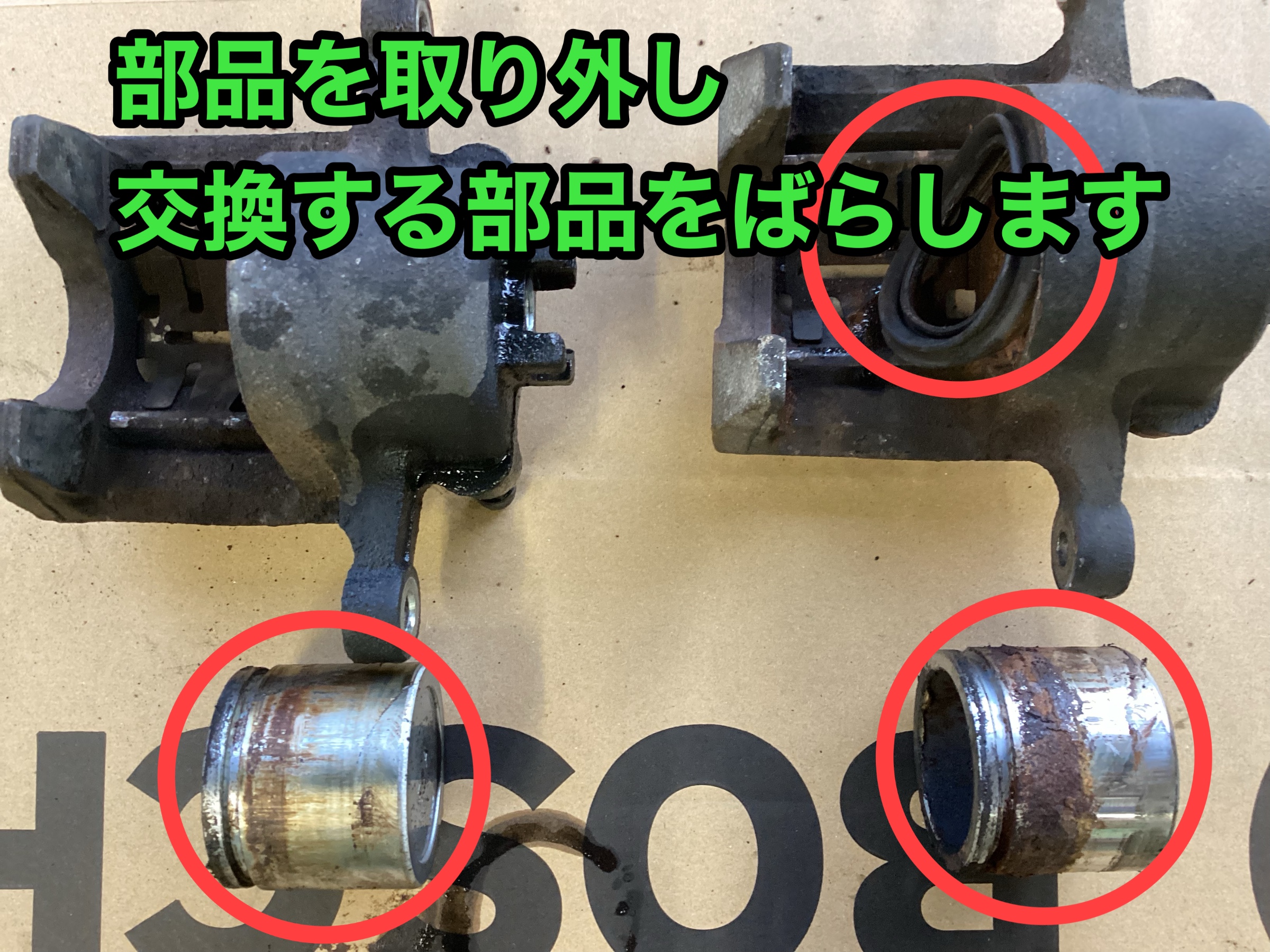 ブレーキキャリパーを取外し、今回交換する赤丸で囲われた部品を交換していきます