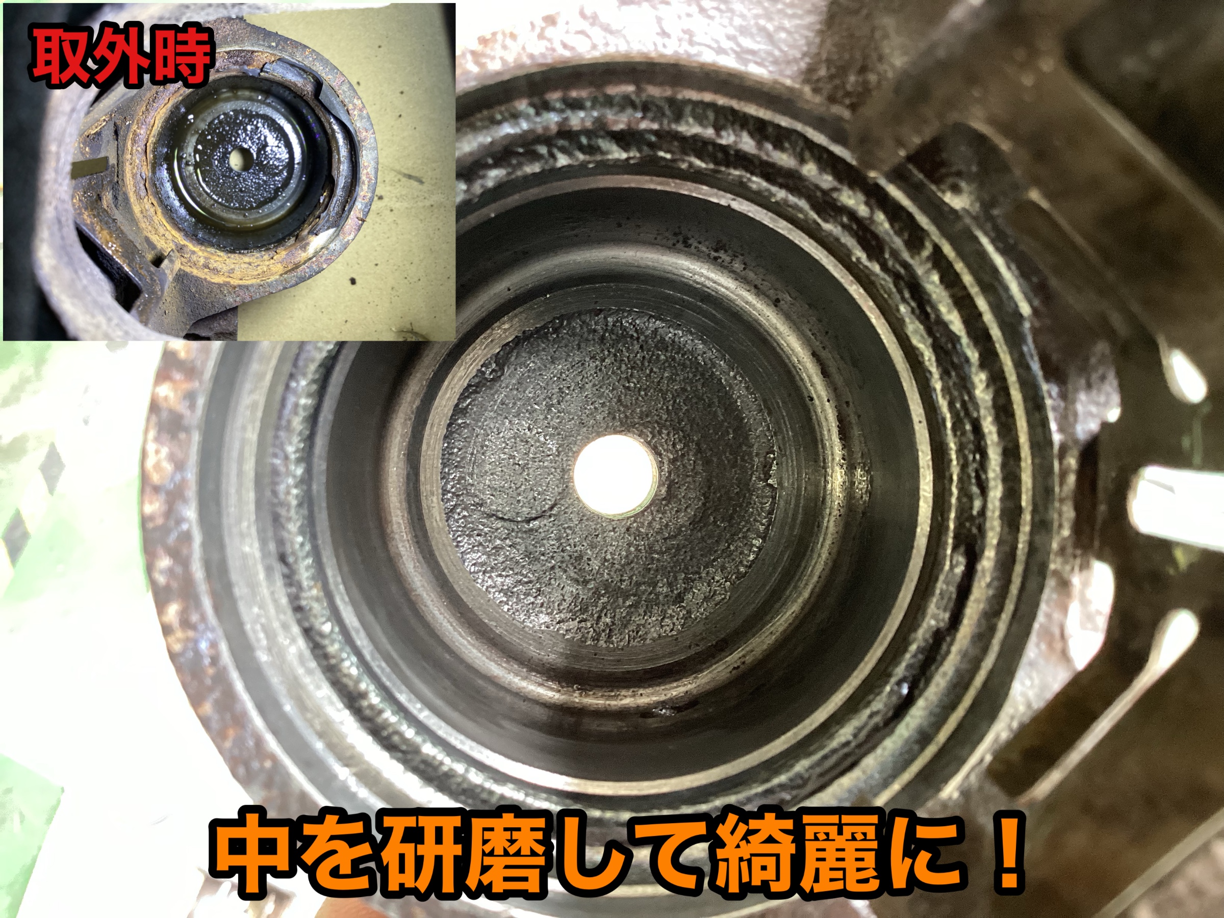 ブレーキキャリパー側のシリンダー取付部も研磨してキレイにします!