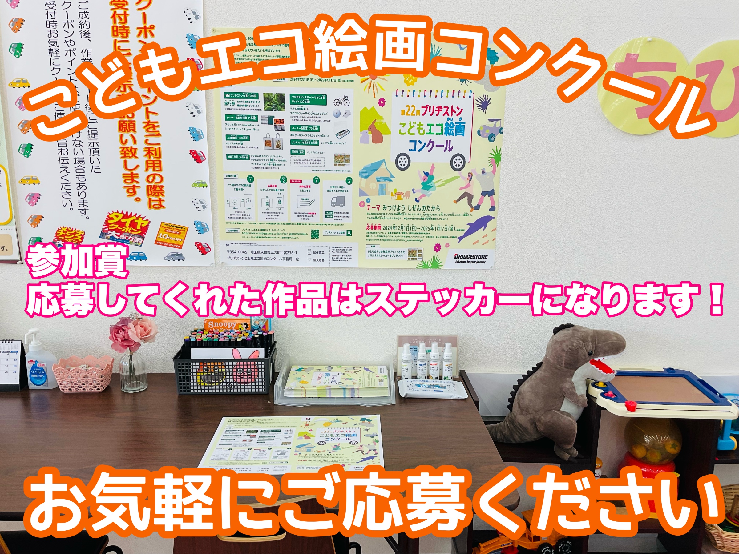 タイヤ館の店舗にある『応募箱』に提出してください。絵は自宅で続きを描いて持ってきてね。