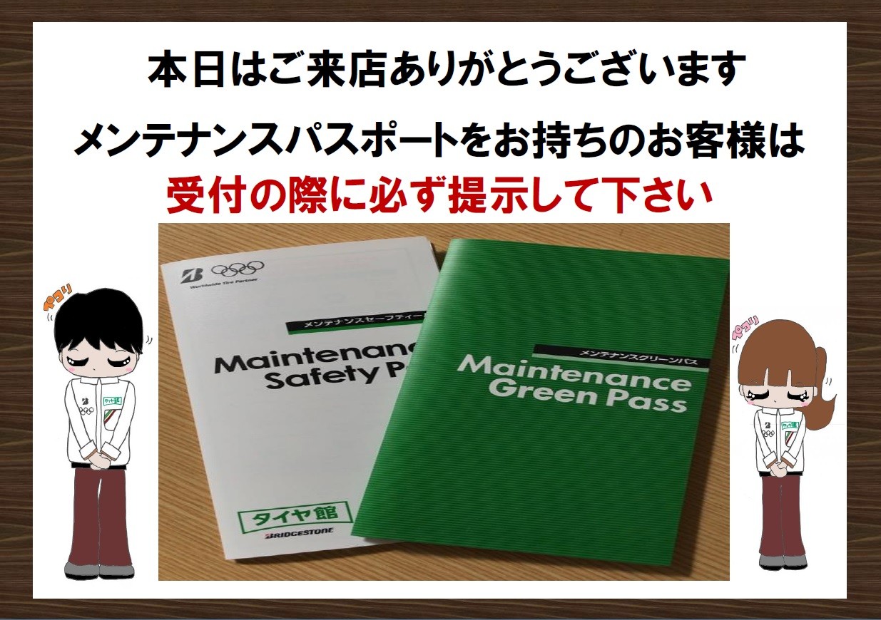 タイヤ館のメンテナンスパスポートをお持ちのお客様は、受付の際お渡しください。