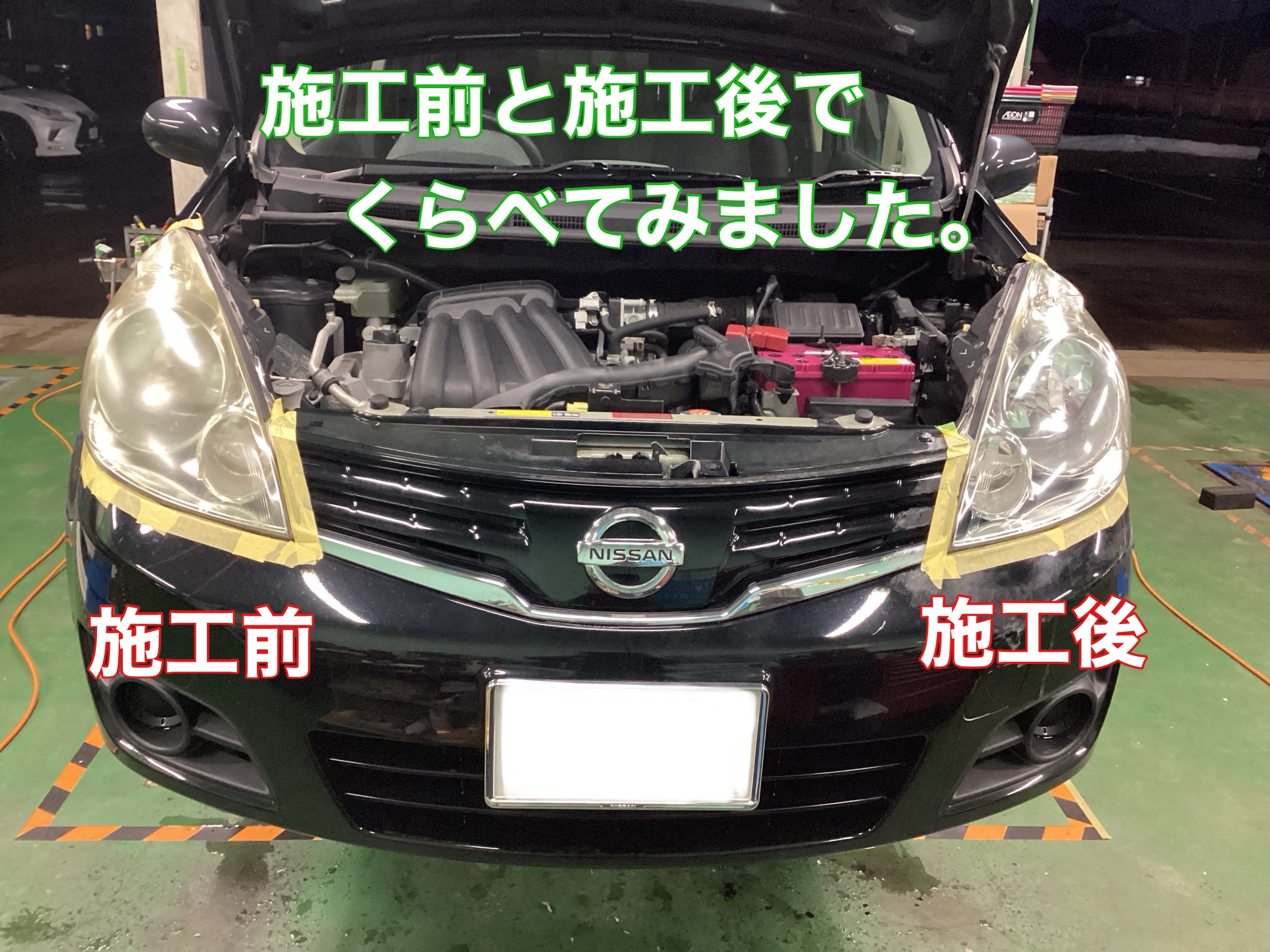 車検で入庫の日産ノートのヘッドライトコーティングです。