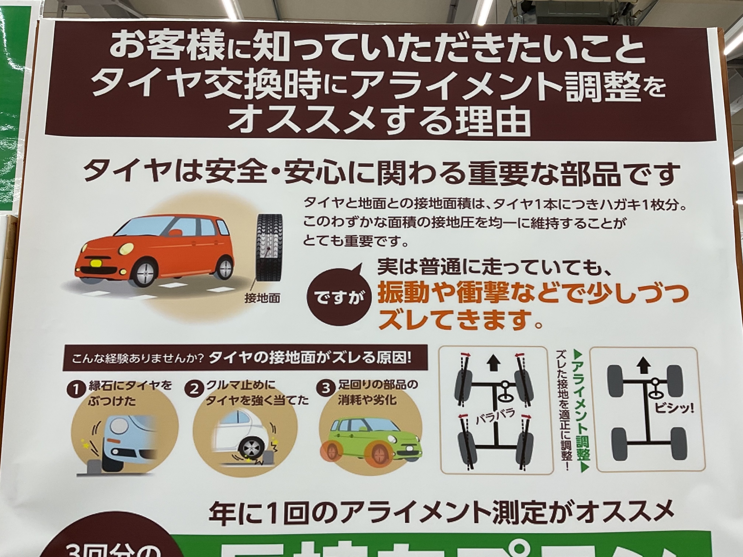 ズレたままですとタイヤが片減りして寿命も短くなってしまいます
