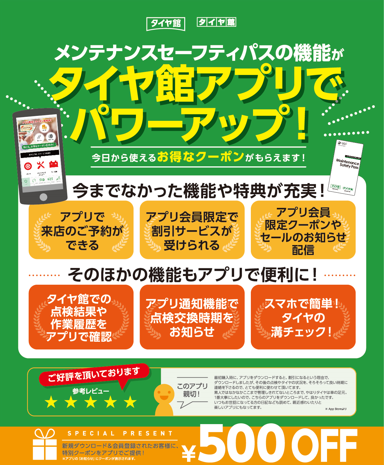 とても便利なアプリですのでタイヤ館をご利用の際はぜひオススメします!