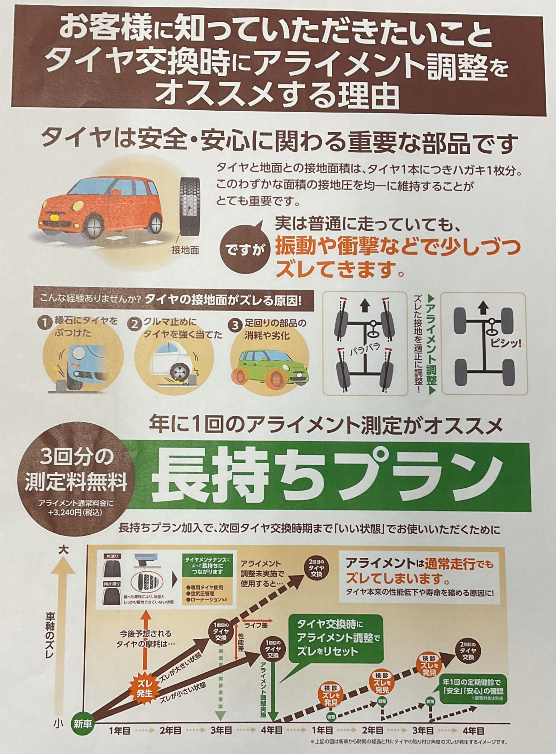 タイヤを長く使っていただく為にアライメント調整+長持ちプランをおすすめしてます