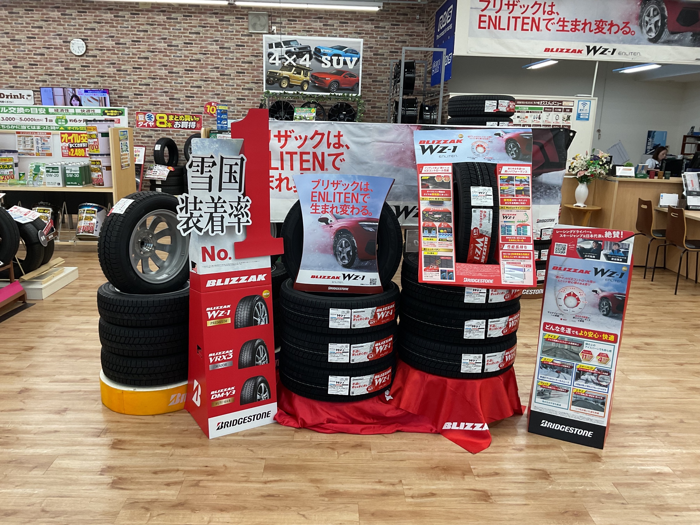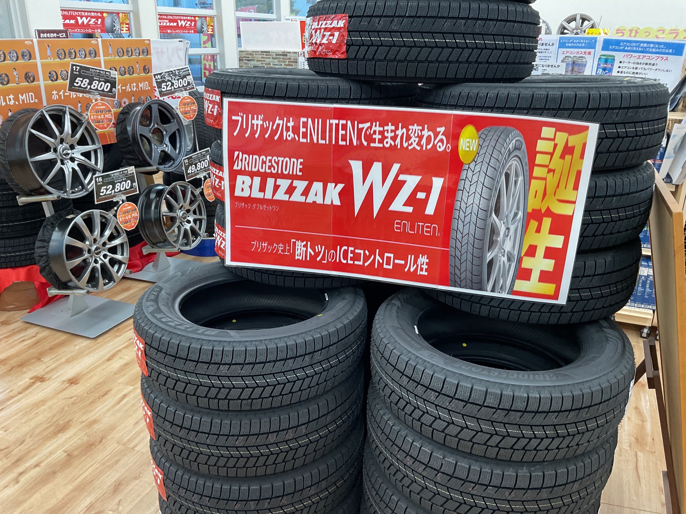 タイヤ館鶴岡では新商品のブリザックWZ−1などのスタッドレスタイヤをはじめ