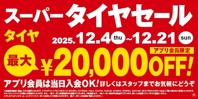 【残り僅か!12/29まで】タイヤ・ホイール・カー用品が最大70%OFF!決算セール! ポスト 2025年12月23日 いつも当店をご利用いただきありがとうございます 11/29(土)から開催中の決算セールも終了まで残り1週間となりました と同時に本年の営業も残り1週間です タイヤはもちろんですが、アルミホイールやカー用品がかなりお得になっております! レイズ・ワークをはじめとしたプレミアムホイールから人気のLEDバルブなども決算価格でご奉仕中! 詳しくは当HP「セール情報」をご確認ください※特価品等アプリクーポン対象外商品もございますのであらかじめご了承ください