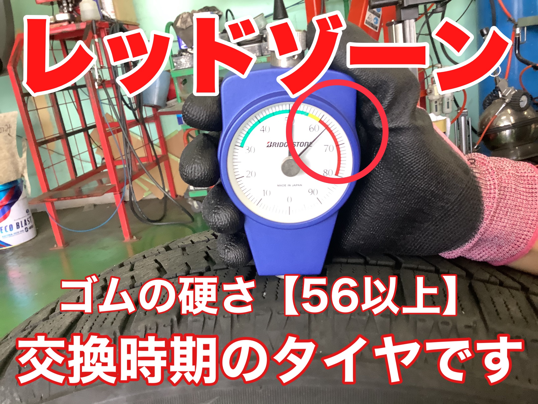 ゴムの硬さも専用の【硬度計】を使って点検しますが針がイエローゾーンやレッドゾーンの場合は交換が必要です。