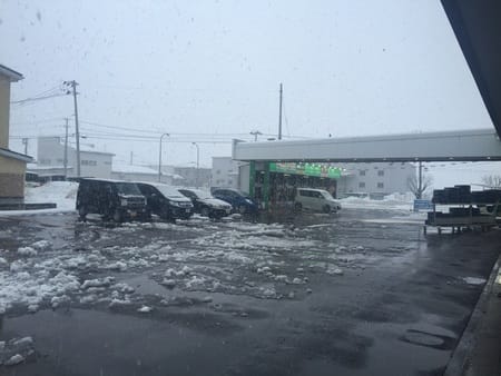 定休日明けの今日、駐車場は雪でいっぱいでした。おとといの夜降った雪の影響です。