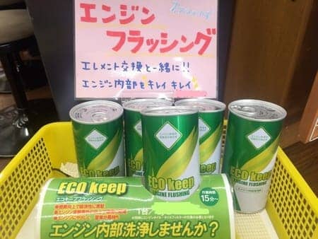 オイルを抜く前に、写真の「エコキープ」をいれ、しばらくアイドリングしておき、エンジン内部に蓄積されたカーボン、スス、ワニスを溶解しオイル内に分散させてから排出します!!