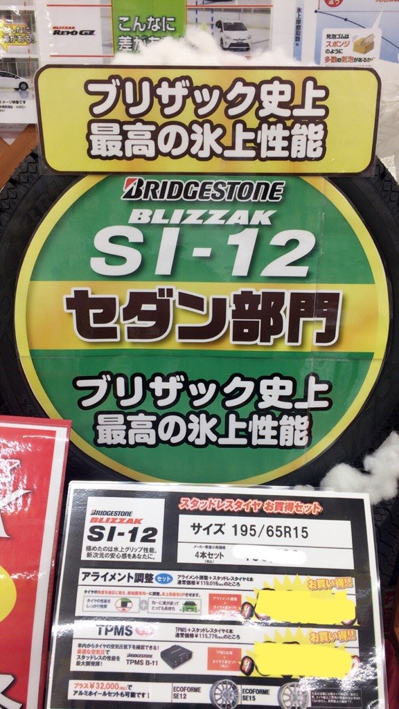 ブリザック史上最高の氷上性能!!『SI-12』!! ポスト 2016年12月17日 あのVRXよりも氷上性能がイイんです!!サイズは下記3サイズのみ限定販売です☆ミ★155/65R14★175/65R15★195/65R15うちの桜井ピット長が昨年より使用していますが氷の上ではホントに良く効くと言っています!(個人の感想になりますが)★ とにかく凍った路面に効くタイヤがほしい方!★あまり距離を乗らない方!数量限定でほんとにお買得価格なんです!! ぜひお試しください(*^_^*) カテゴリ:お知らせ