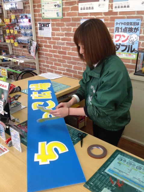 2017年1月20日 大寒! ポスト 2017年1月20日 本日は天候も穏やかです。お客様のご来店も若干穏やかでした(*_*)そんな中、櫻井さんは車検を菅原さんは、ちびっ子広場のPOP作成中‼︎皆さんタイヤの空気圧点検はしてますか?寒くなると空気圧は下がります。空気圧が適正でないとタイヤが変な減り方したり寿命が短くなったり、スタッドレスタイヤの本来の性能が発揮出来ずに滑りやすくなる事も気になる方はタイヤ館へレッツ ゴー(・ω・)ノ 担当:武田