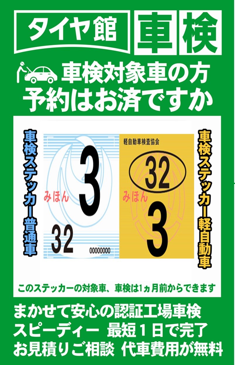 3月車検のお客様へ ポスト 2020年2月23日 車検は有効期限の1ヶ月前から受けられます! (期限前に車検を受けても継続は有効期限日からとなります) 代車が必要なお客様はゆとりをもってお早めにご予約下さいね☆ミ 車検の流れとしましては・・・・ 一度ご来店いただき事前に車両点検を行います。(20分~30分) 車検費用のお見積もり 車検日のご相談 ご予約という流れになります。 車検証・納税証明書・自賠責証書が必要となりますのでご確認下さい。 カテゴリ:お知らせ