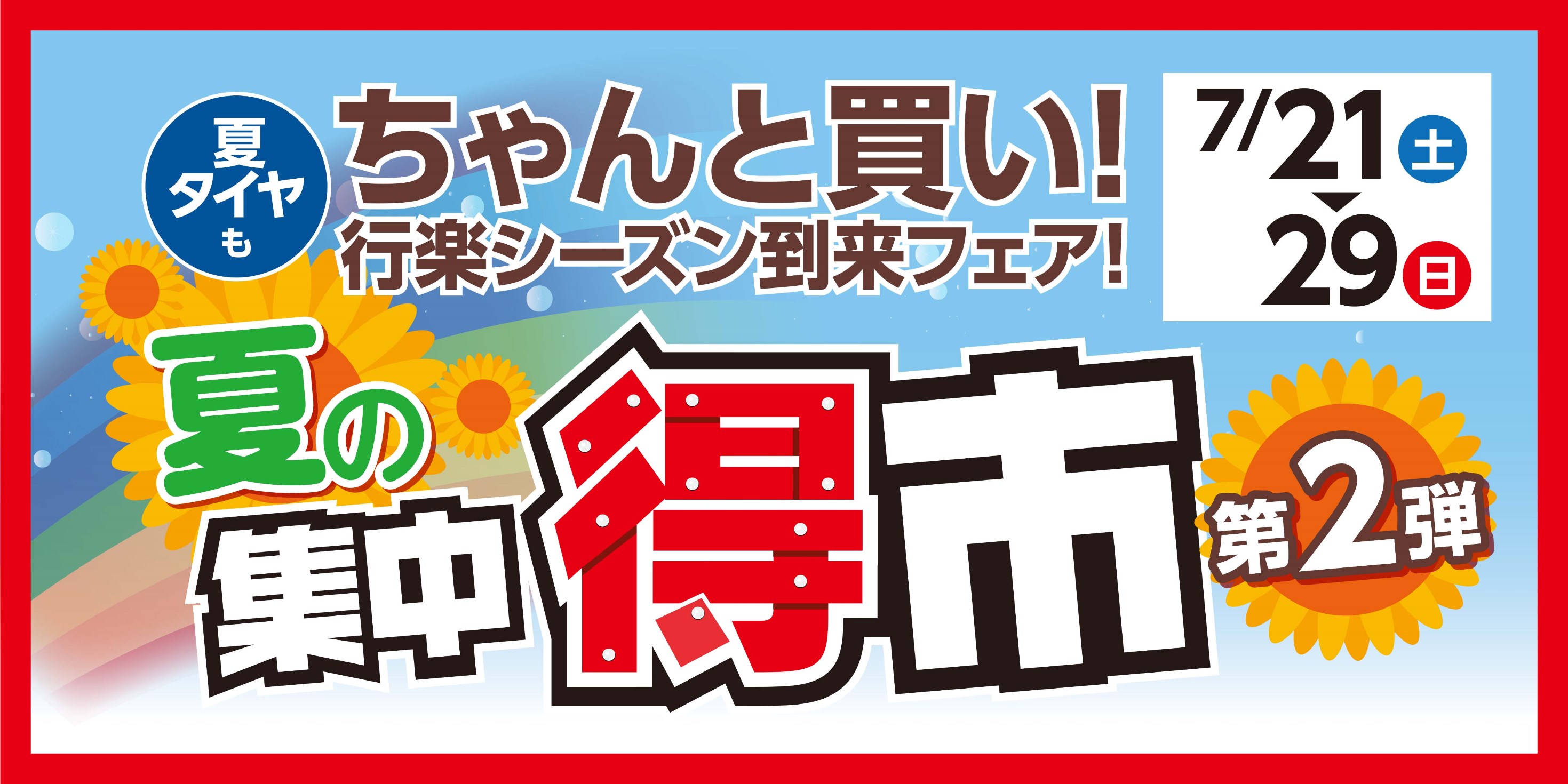 明日からセール始まるよ~(*^_^*) ポスト 2018年7月20日 こんにちは~(*^_^*) いよいよ明日21(土)~29(日)まで、集中得市を開催いたします(#^.^#) 夏タイヤはもちろん、スタッドレスもお買い得です! トラブルが多いお盆休みの前に、タイヤ・バッテリーオイル交換など、しっかりメンテナンスしておきましょう(#^.^#) 皆様のご来店お待ちしております(#^.^#) 担当:スガワラ