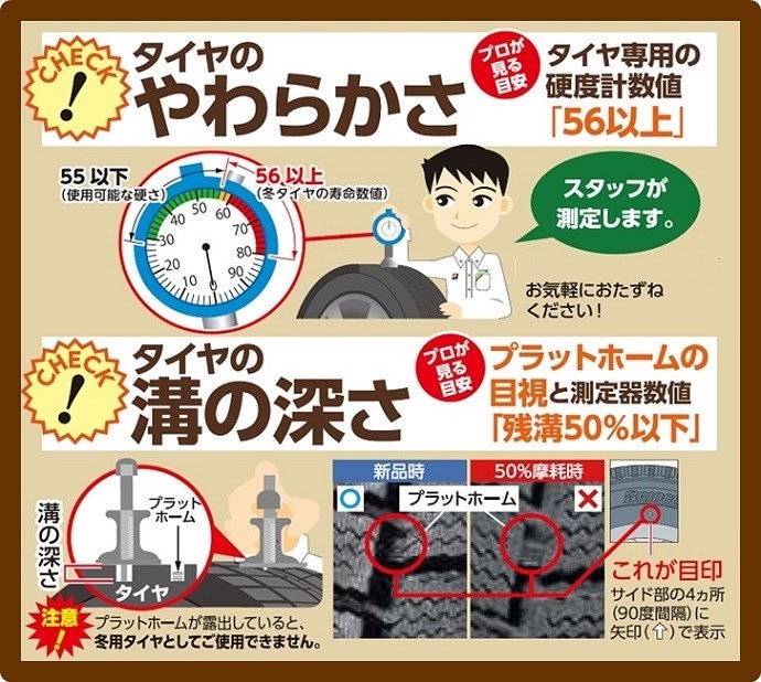 ○空気圧調整 ○ナット増し締め ○硬度チェック ○残溝チェック