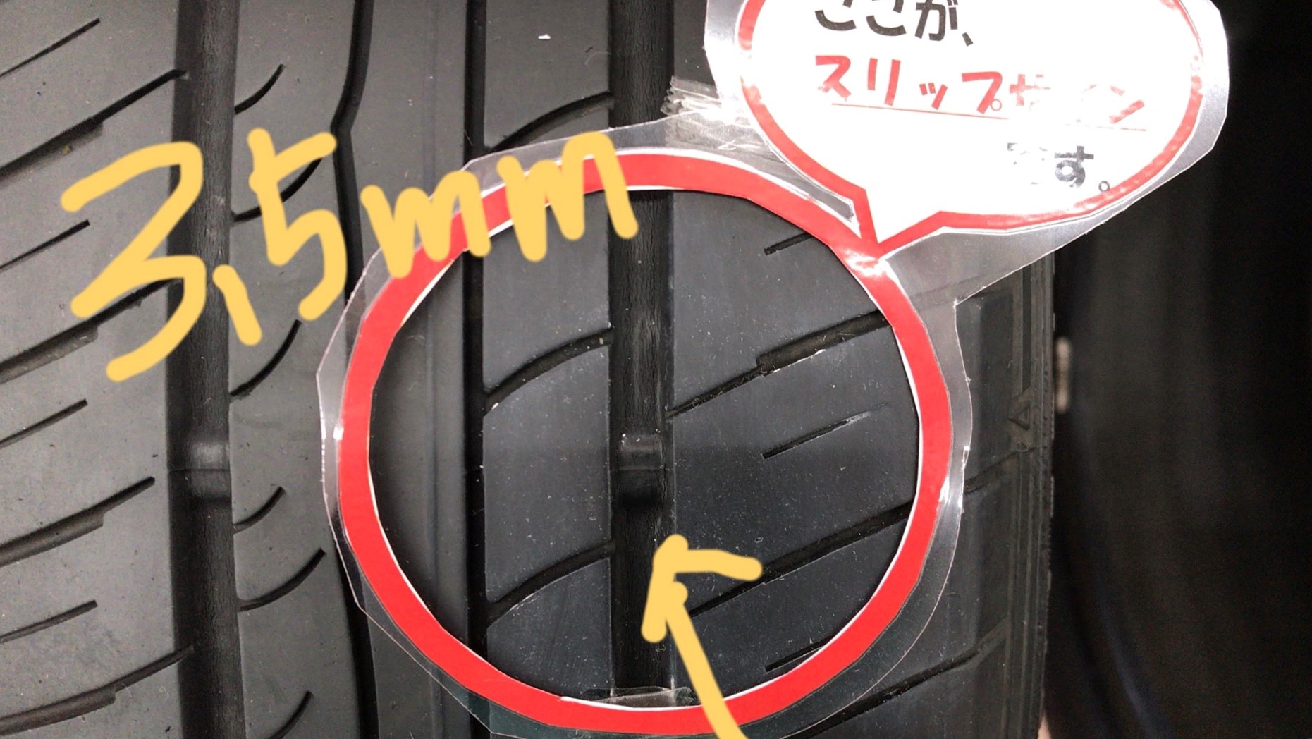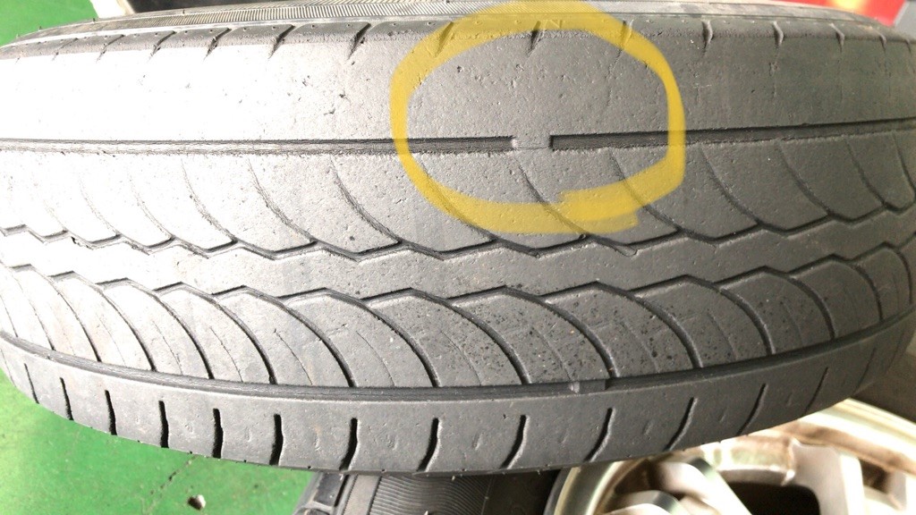下の写真は、スリップサインがすでに出てしまっているタイヤです(/ω\)
