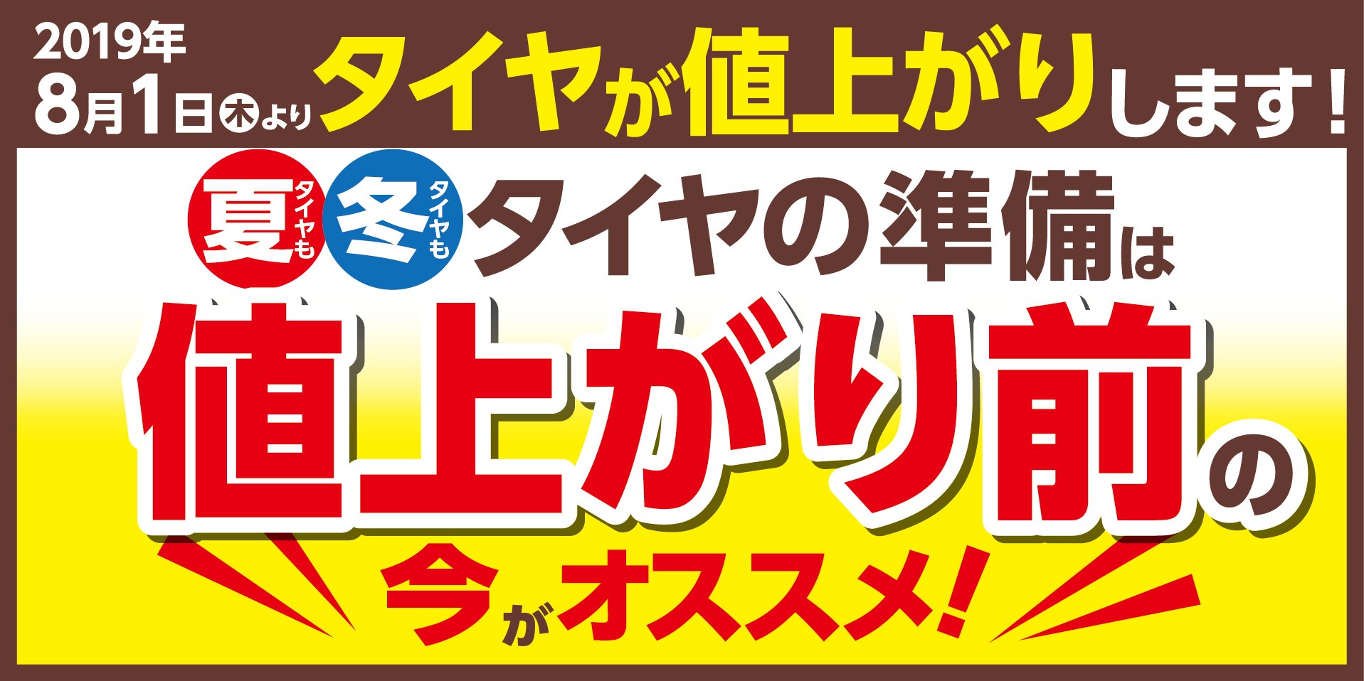 タイヤが値上がりします! ポスト 2019年6月14日 8月1日より、タイヤの値上がりが決定しました。 10月から消費税も上がる予定になっておりますので、買い替えをご検討しているお客様は7月中に購入しておいた方が出費を抑えられそうです。 夏タイヤも冬タイヤも今のうちがイイですね(*´▽`*) ぜひぜひタイヤ専門店にご相談くださいね~(*^_^*) お待ちしております☆彡 担当:スガワラ