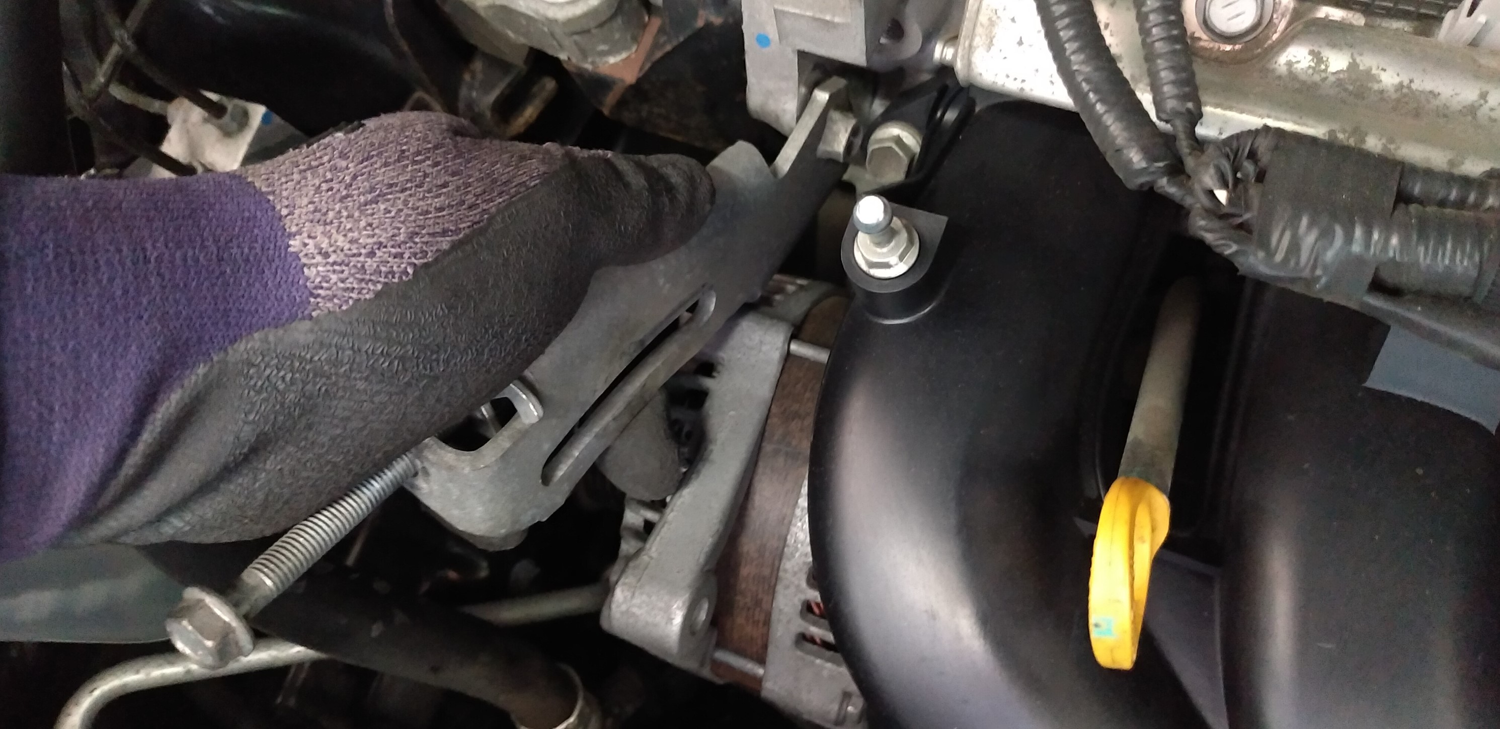 アジャスターを緩めオルタネーターをファンベルトが緩む方向へ動かします(下写真)