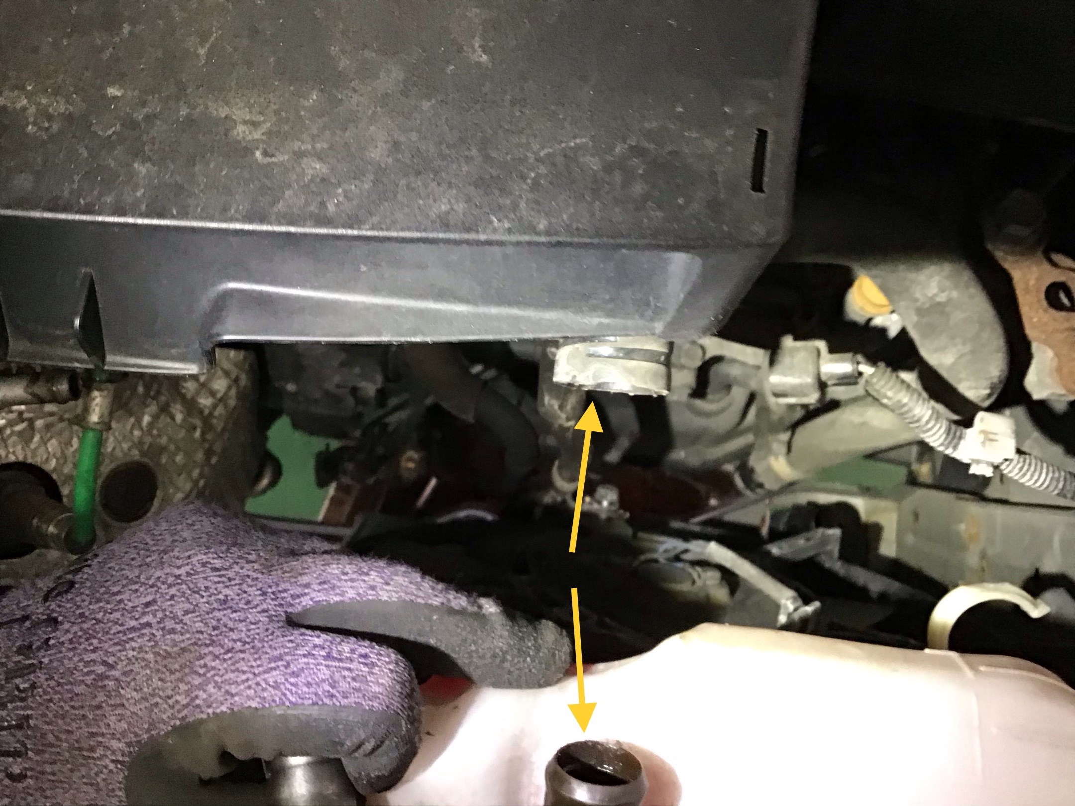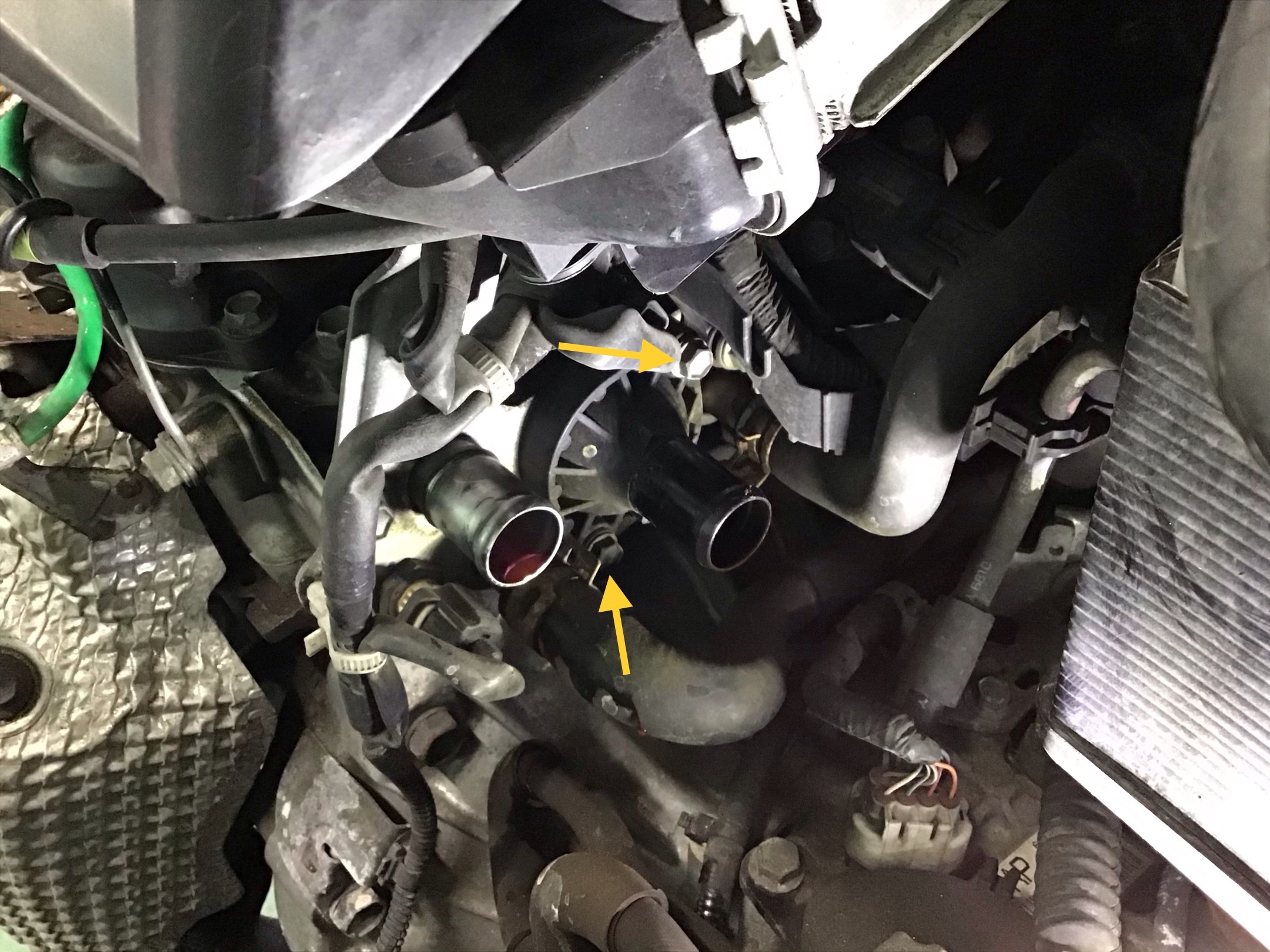 ATFクーラーホース・ラジエターロアホースを取り外します。 【下写真 矢印3ヶ所】