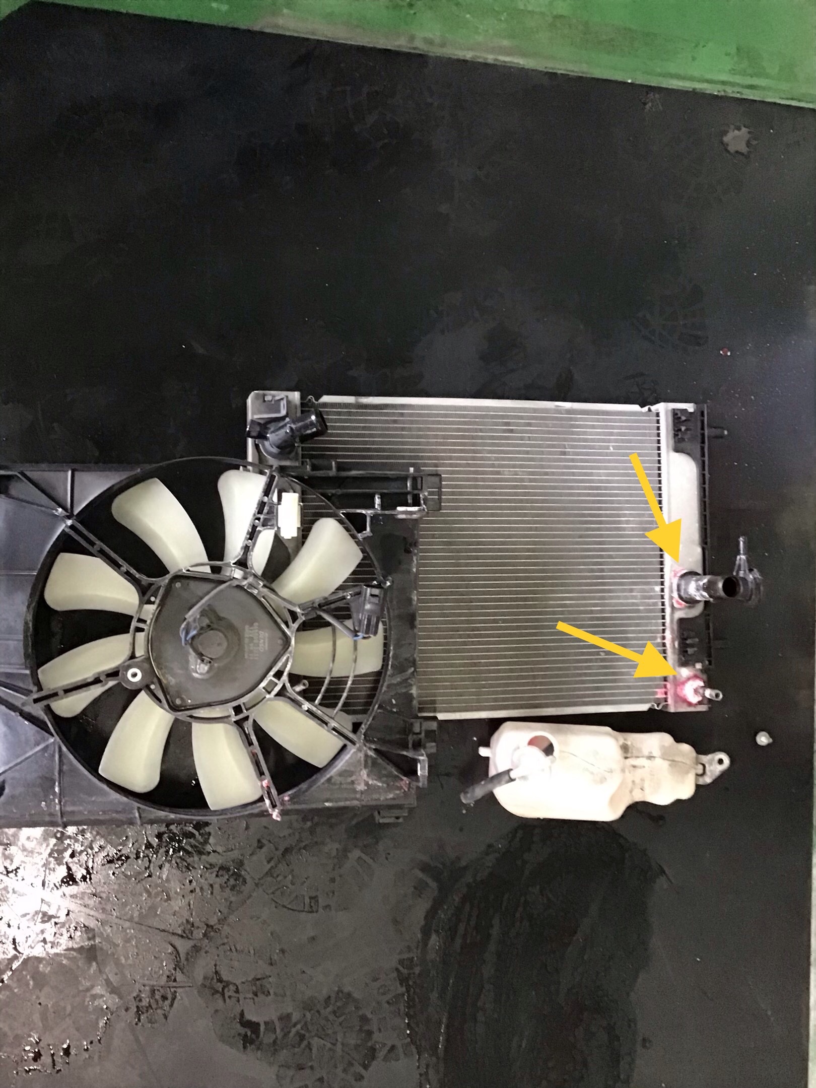 ラジエター本体からファンシュラウド・リザーバータンク・下側についている固定用のゴムを取り外します。 【下写真 本体から取り外した所 矢印部から漏れている】