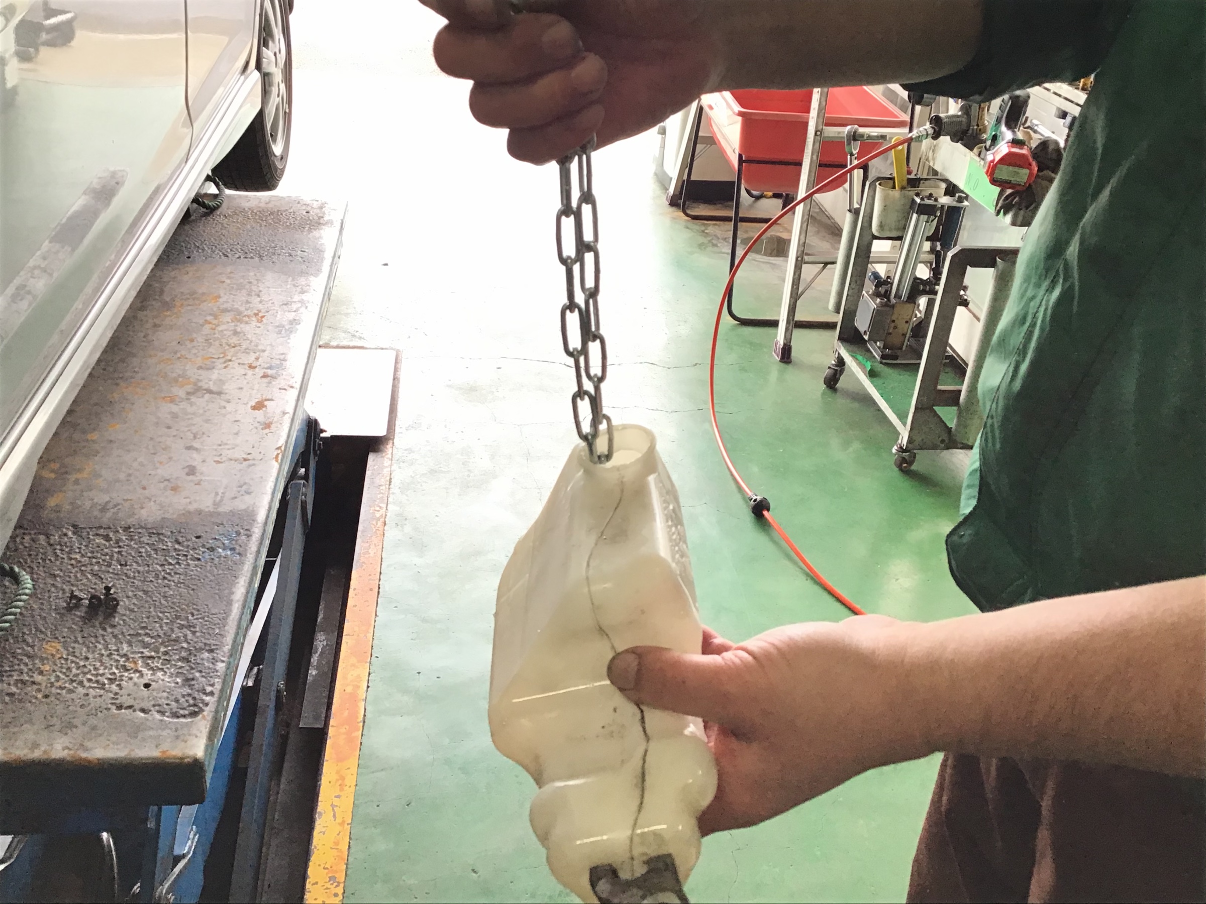 水を7〜8割入れたリザーバータンクに適当な長さのチェーンを入れてタンクを振るります。