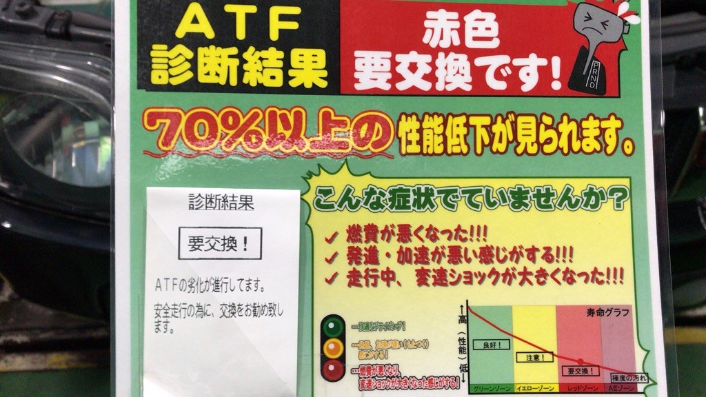 オイル交換でご来店いただき、安全点検の結果オートマオイルが【要交換】となりました。