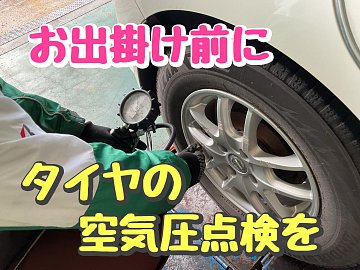 いつも当店をご利用いただきありがとうございます タイヤ履き替え後の点検お済ですか? 当店では店舗で履き替えした方だけでなく、ご自宅でタイヤ履き替えされた方への点検も無料で行っております! 年末年始のお出かけ前にぜひ当店でタイヤ点検しましょうね! タイヤ空気圧補充 ナットの締付点検 ...