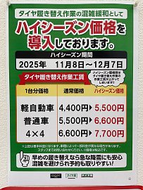 こんにちはタイヤ館鶴岡です\(^-^ ) まだ10月ですが、今年もタイヤ交換の時期が 近づいて来ました。 今年もハイシーズン価格導入です。 11月8日〜12月7日まで、通常価格プラス1100円になりますので 早めの交換、予約をオススメします。