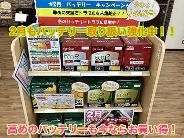 2月 バッテリーキャンペーン実施中! タイヤ館鶴岡では2月バッテリーキャンペーン中です! バッテリー全品15%OFFです! まずはお使いのバッテリーが正常か交換が必要か点検しましょう! 無料点検も行っておりますので、お気軽にお越しください! 冬のバッテリートラブルが多い時期に早めの交換で...