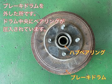 走行中にリヤから音がするとノートでご来店されました。 走行すると右リヤから『ゴー』音を確認。 ハブベアリングの音と判断して左右とも部品入庫後に交換する事にしました。 タイヤを外しブレーキドラムを外します。 ブレーキドラムを取り付け、タイヤを取り付けます。 試乗して異音がしないのを確...
