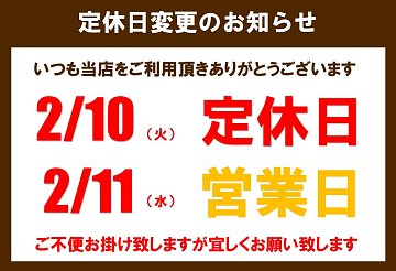 いつもタイヤ館鶴岡をご利用いただきありがとうございます。 明日 2月10日(火) は定休日、 明後日 2月11日(水)が営業日となりますのでよろしくお願いします。 また、2月17日(火) 2月18日(水)も定休日になります。 今月はレディースデーが2回お休みになりますのでよろしくお願いします。