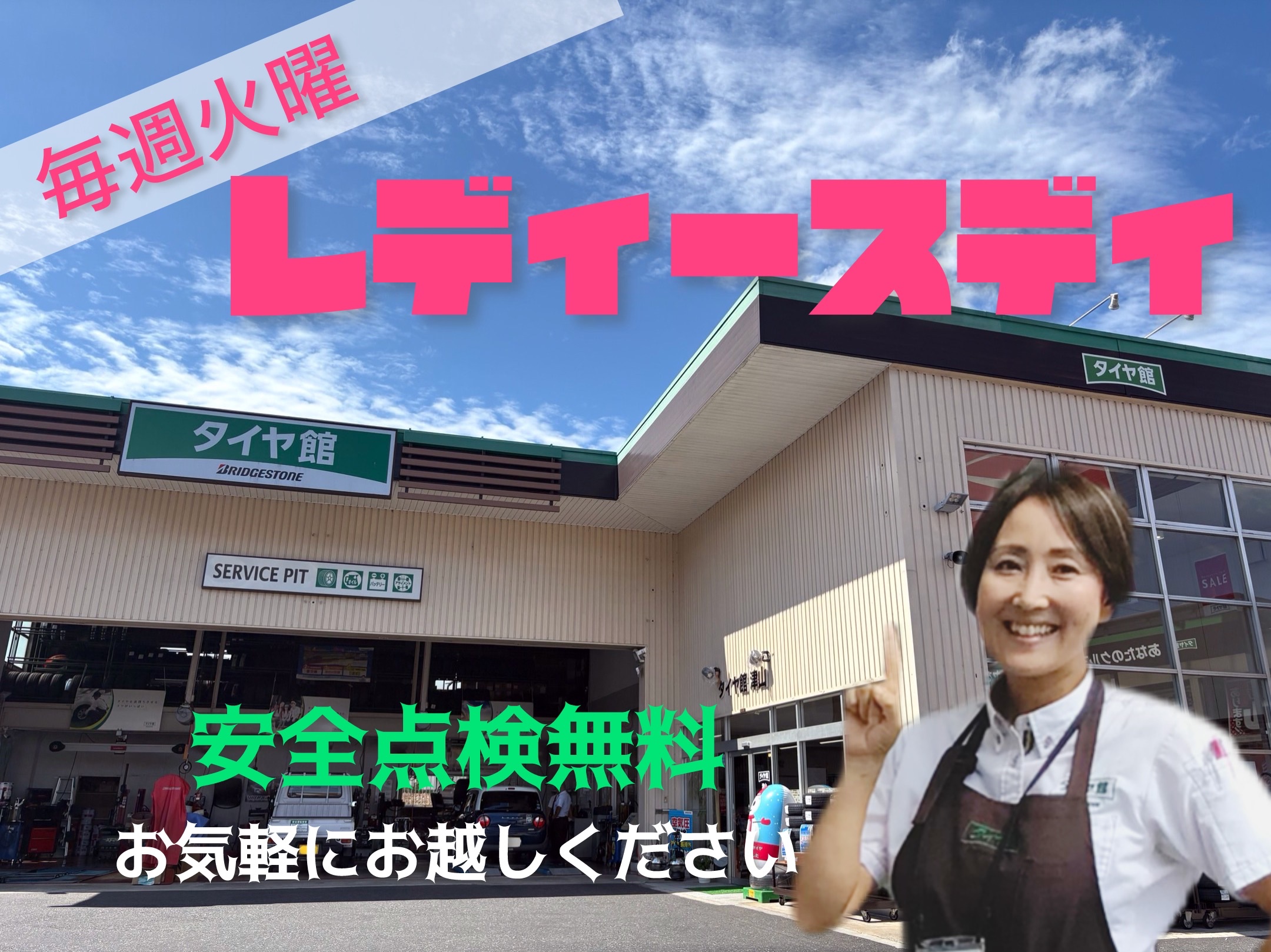 今日はレディースデイです ポスト 2026年1月20日 毎週火曜日はレディースデイ。 エンジンオイル交換がお得! バッテリーが通常販売価格の10%OFF! また、商品ご購入の女性のお客様限定で粗品を進呈! たくさんのご来店、お待ちしております。 タイヤ館 津山 住所:708-0883岡山県津山市一方329 電話番号: 0868-24-6859 クルマの安全点検 バッテリー交換 担当:西川