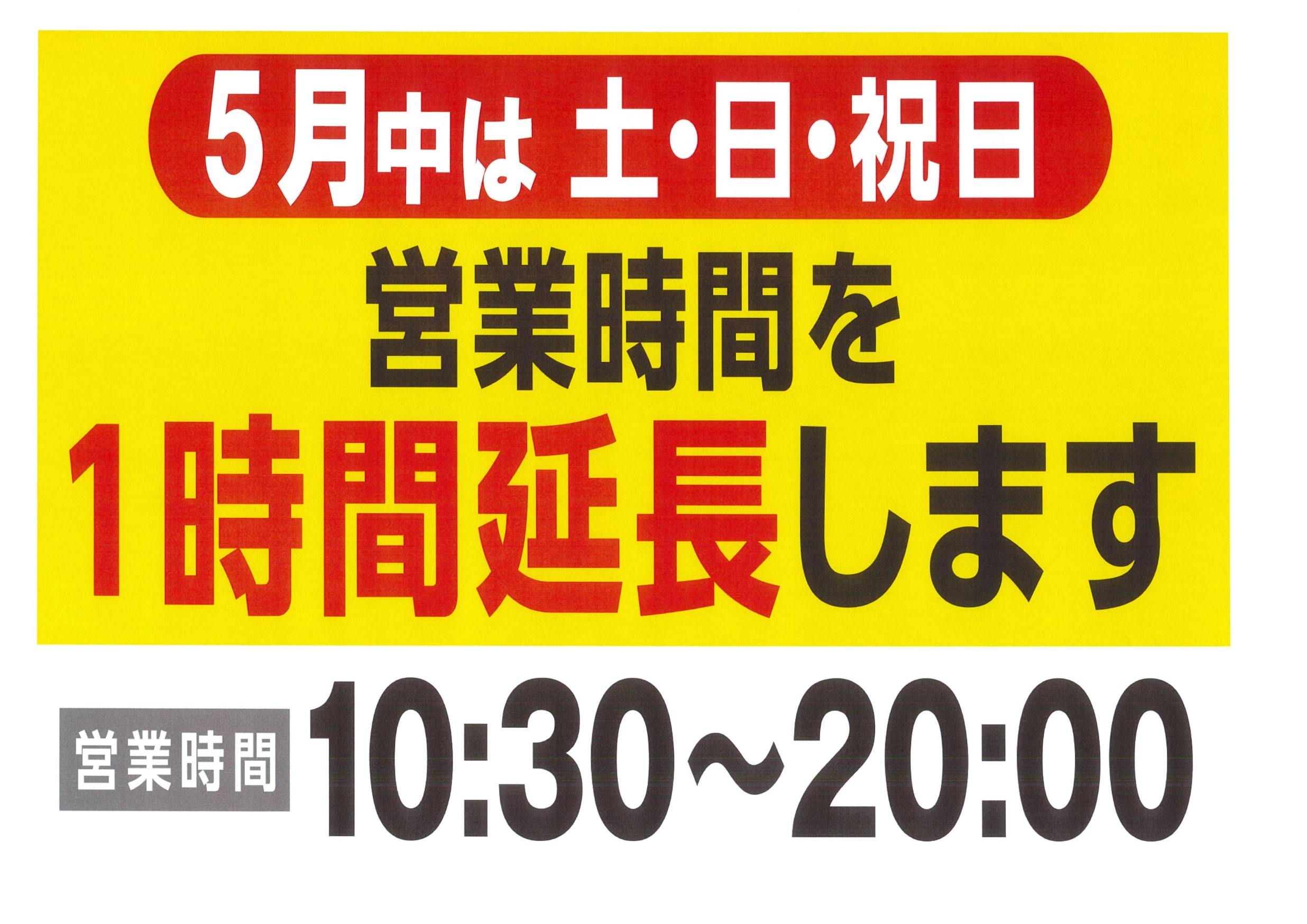 5月中の週末の営業時間延長のお知らせ( *´艸`)