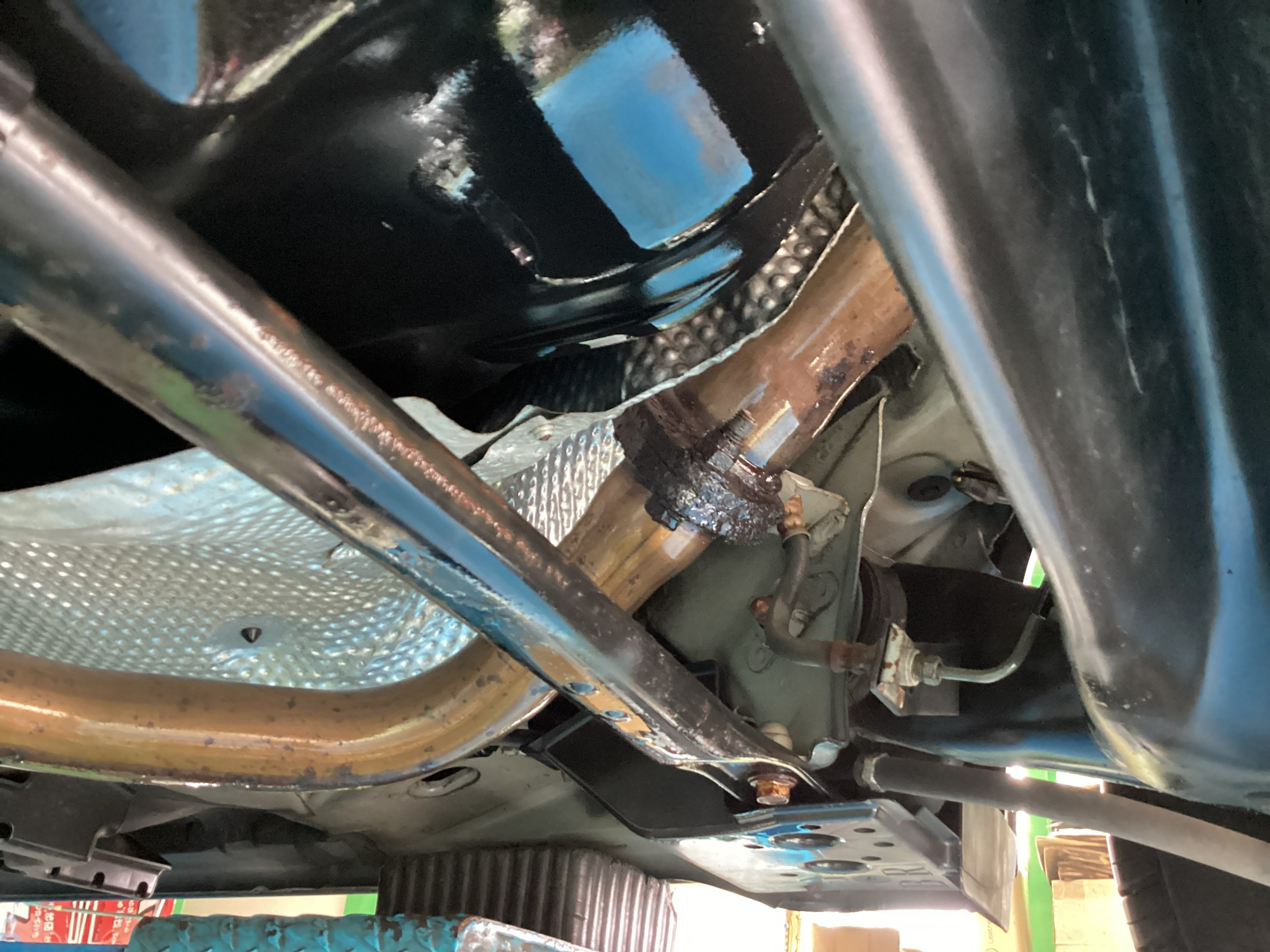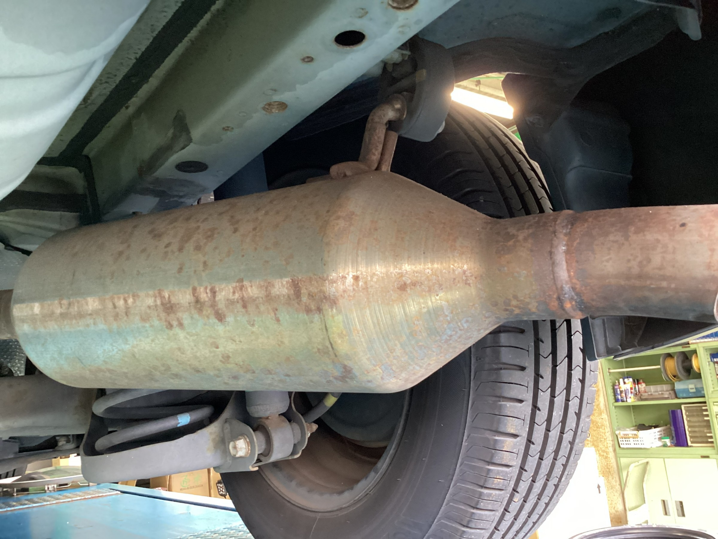 マフラー部分も現状はまだ平気ですが、早めの施工で錆の発生の予防をします