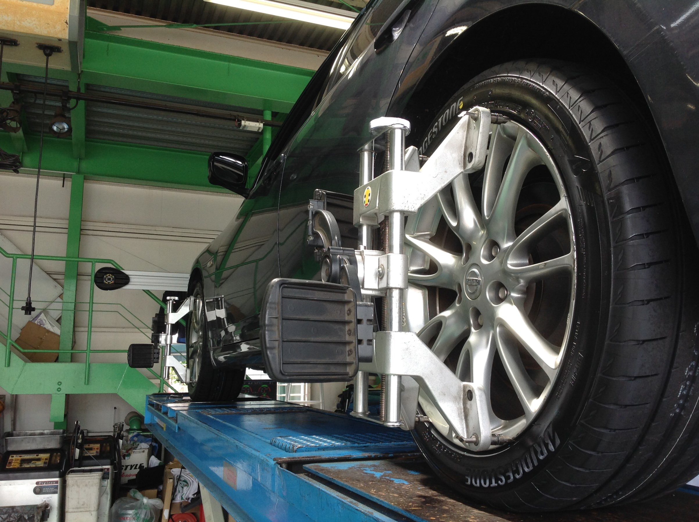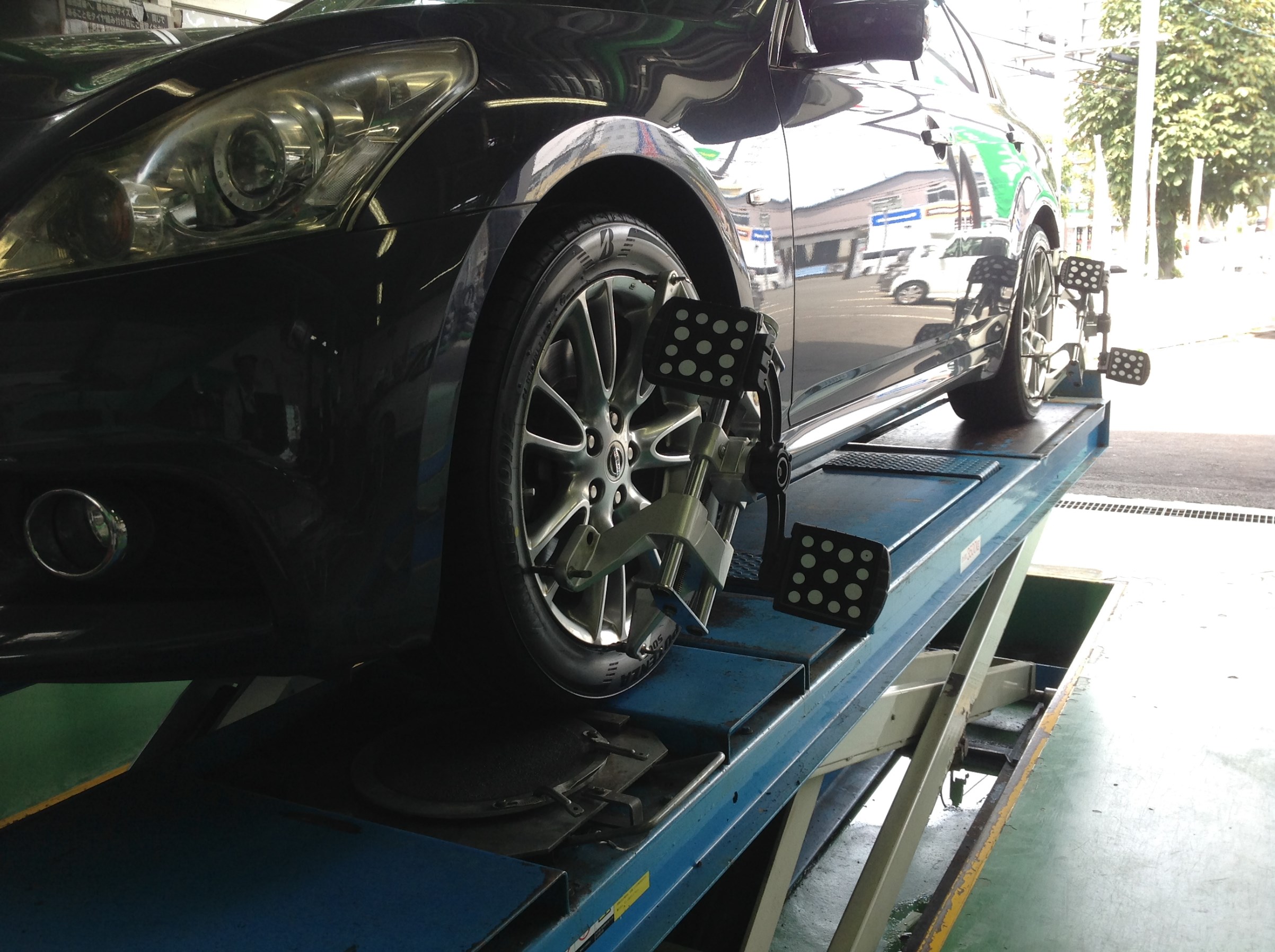 タイヤについている機械と奥にあるセンサーを接続させてランアウトを行ないます。