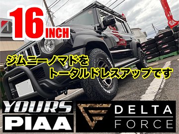 話題のジムニーノマド入庫しました 今回はトータルドレスアップです まずはホイール デルタフォース OVERLANDER 16x6.0 -5 5-139 マットスモークポリッシュ 続いてルーフキャリア ユアーズ ジムニーノマド専用ルーフキャリア LED作業灯も装備された専用キャリアです ユアーズ ノマド専用サイドステ...