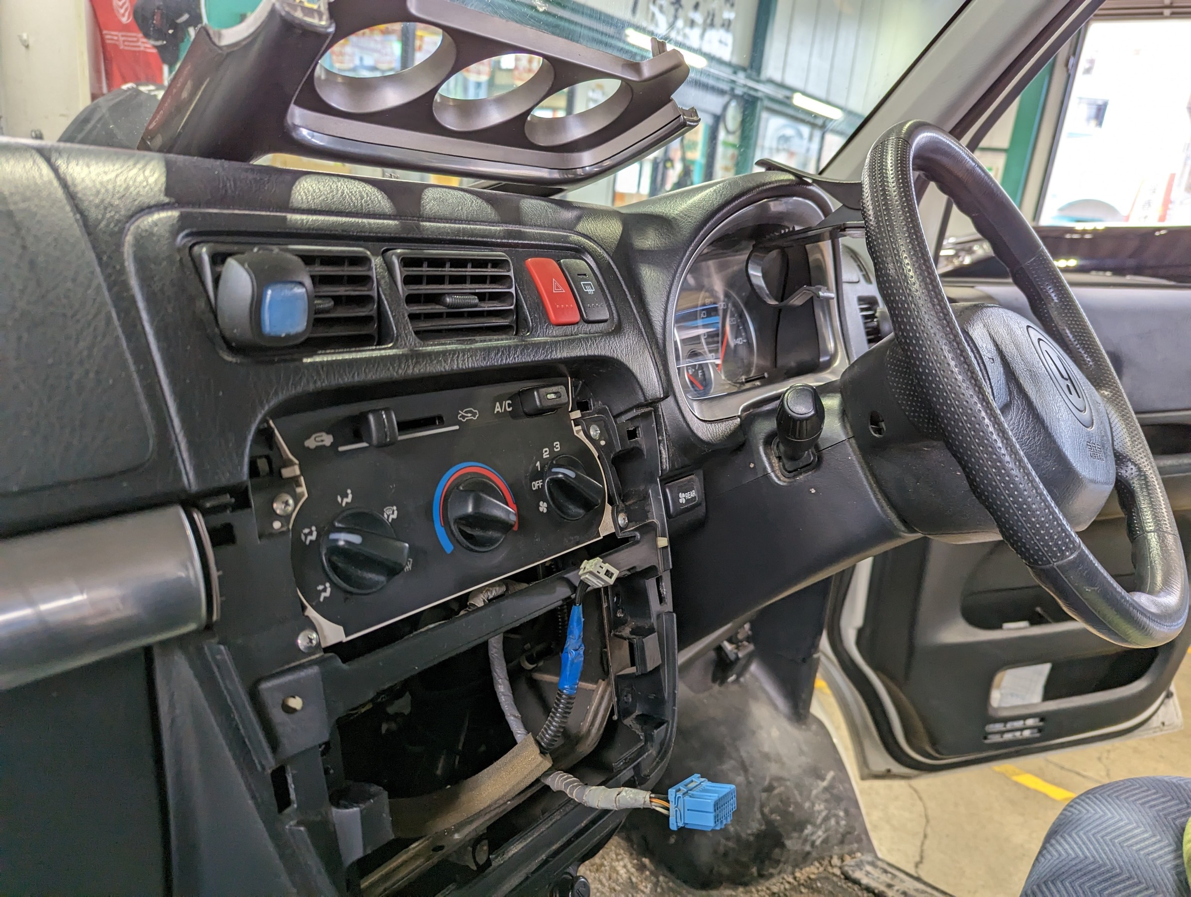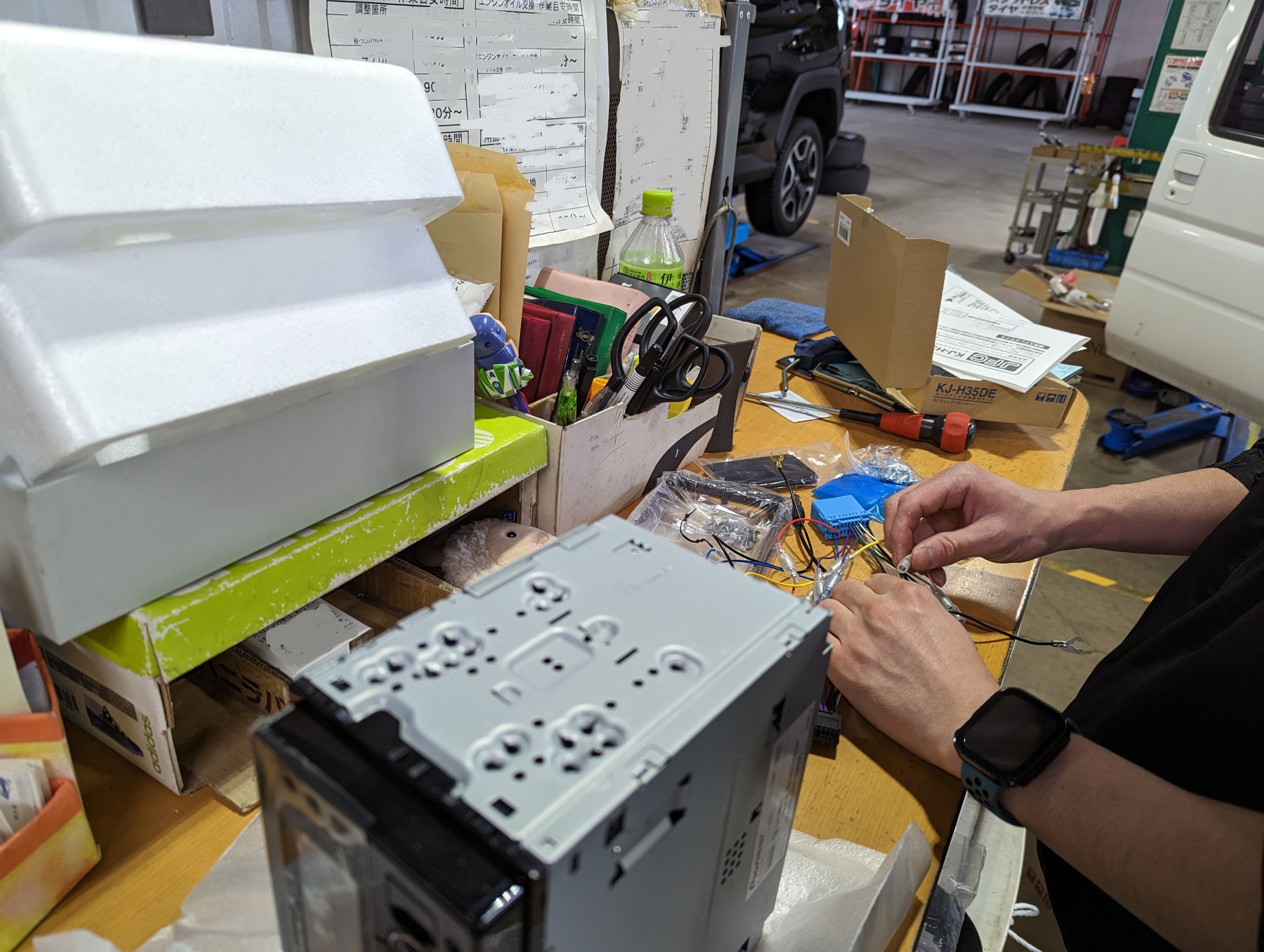 オーディオのハーネス、まぁ、コンセントのようなものを取付して、車へ戻します。