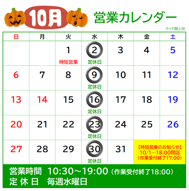 10月 定休日のご案内 ポスト 2024年10月1日 いつも タイヤ館上田 をご利用いただきありがとうございます。 10月になり朝晩がすごしやすい気温となりましたが、残暑がまだまだ残っている ので体調にはお気を付けください。 10月の営業案内です。 毎週 水曜日が定休日となります。 10月1日(火) → 18:00閉店 10月6日(日) → 18:30閉店 上記の2日間は時短営業となります。 ご不便をおかけしますが、ご理解の程、お願いいたします。 担当:柴﨑